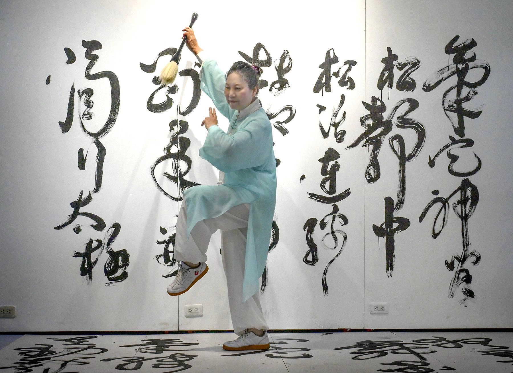 在松園的-舞墨太極-現場揮毫作品,移至東華大學招生代言,開心。書法作品200X360cm釋文:氣定神