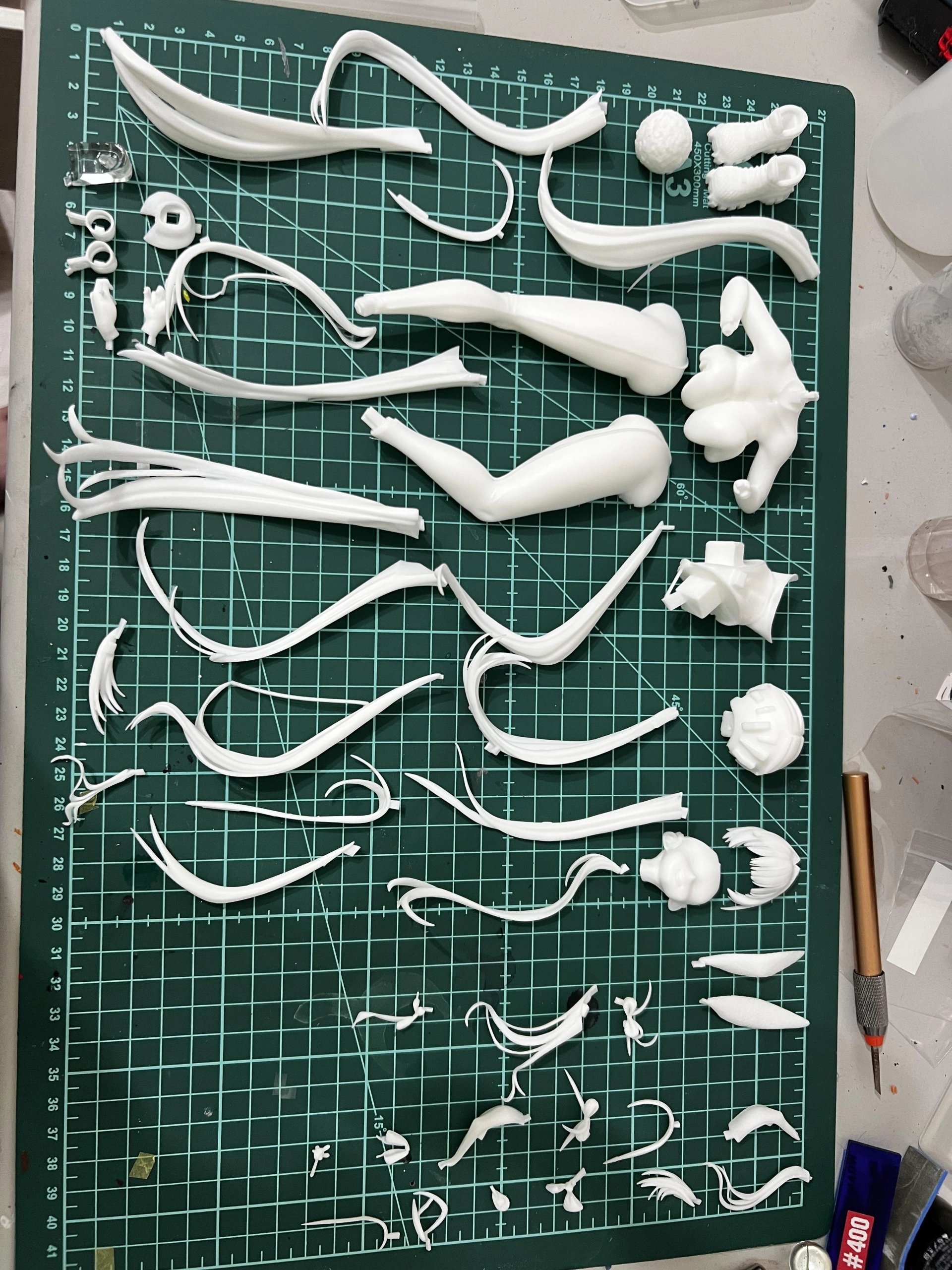 先去網路上購買樹酯原模,買到後先用沙拉脫(洗碗機)洗掉脫模劑(離型劑)確保不會影響到漆面的穩固,然後再進行修件,去除水口跟沙孔以及細節的銳化,然後假組看看有什麼地方需要使用AB補土進行填縫美觀,再來進行上色,膚色這次特別使用透膚法進行上色,所有零件均先噴塗陰影再蓋上主色,最後打樁固定