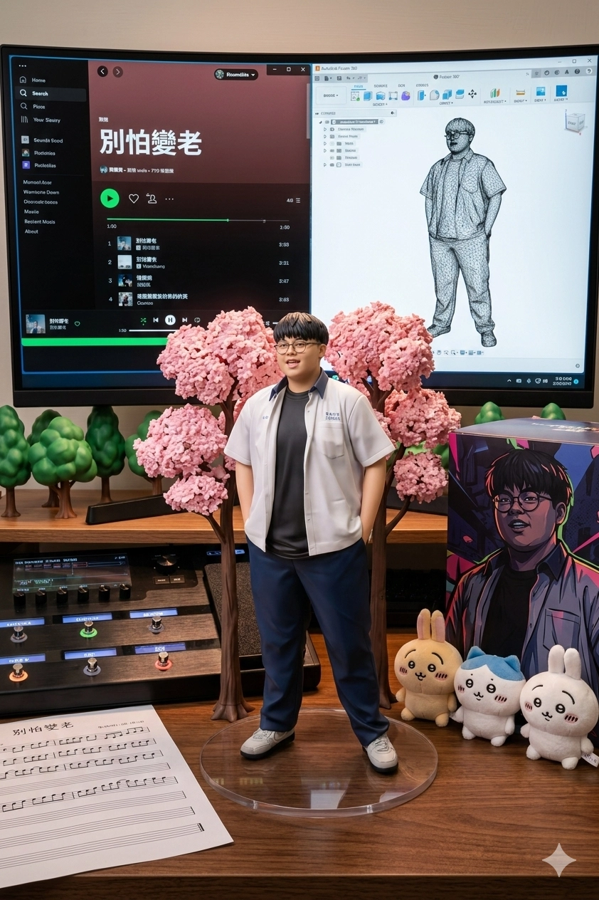 請用我提供的原圖,把圖片內主體變成電腦桌前的立體公仔。場景為一張電腦書桌,上面擺放著一個1/7比例的