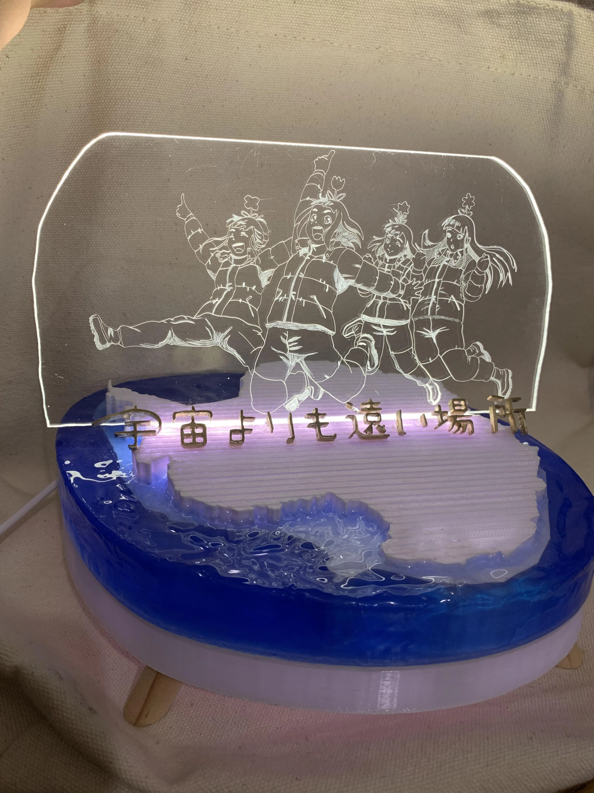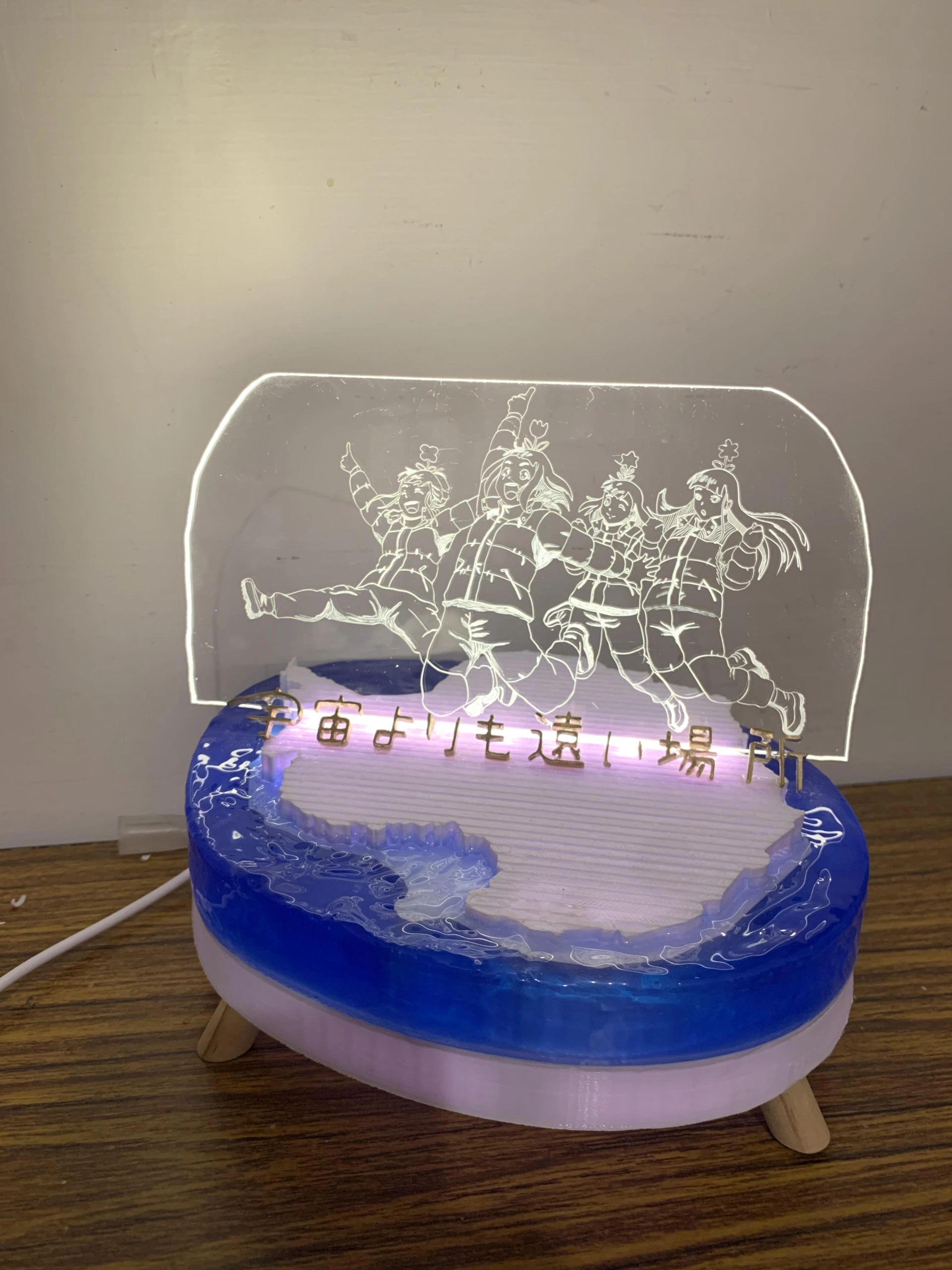 我以四位女主角在南極大陸上為意境創造,藍色的部分是海洋🌊,白色的部分是南極大陸的俯視圖,然後那個用黃銅做的字是這部動漫的名字《宇宙よりも遠い場所》