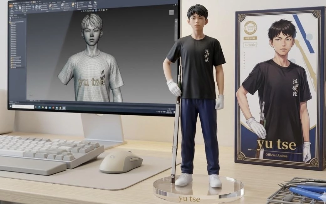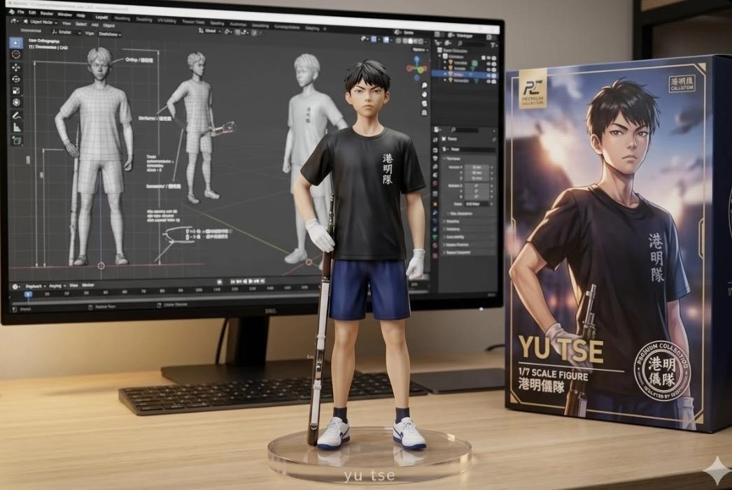 電腦桌上面擺放著一個1/7比例的PVC公仔,角色以站立姿態呈現,手拿儀隊的槍,並固定在透明圓形底座上