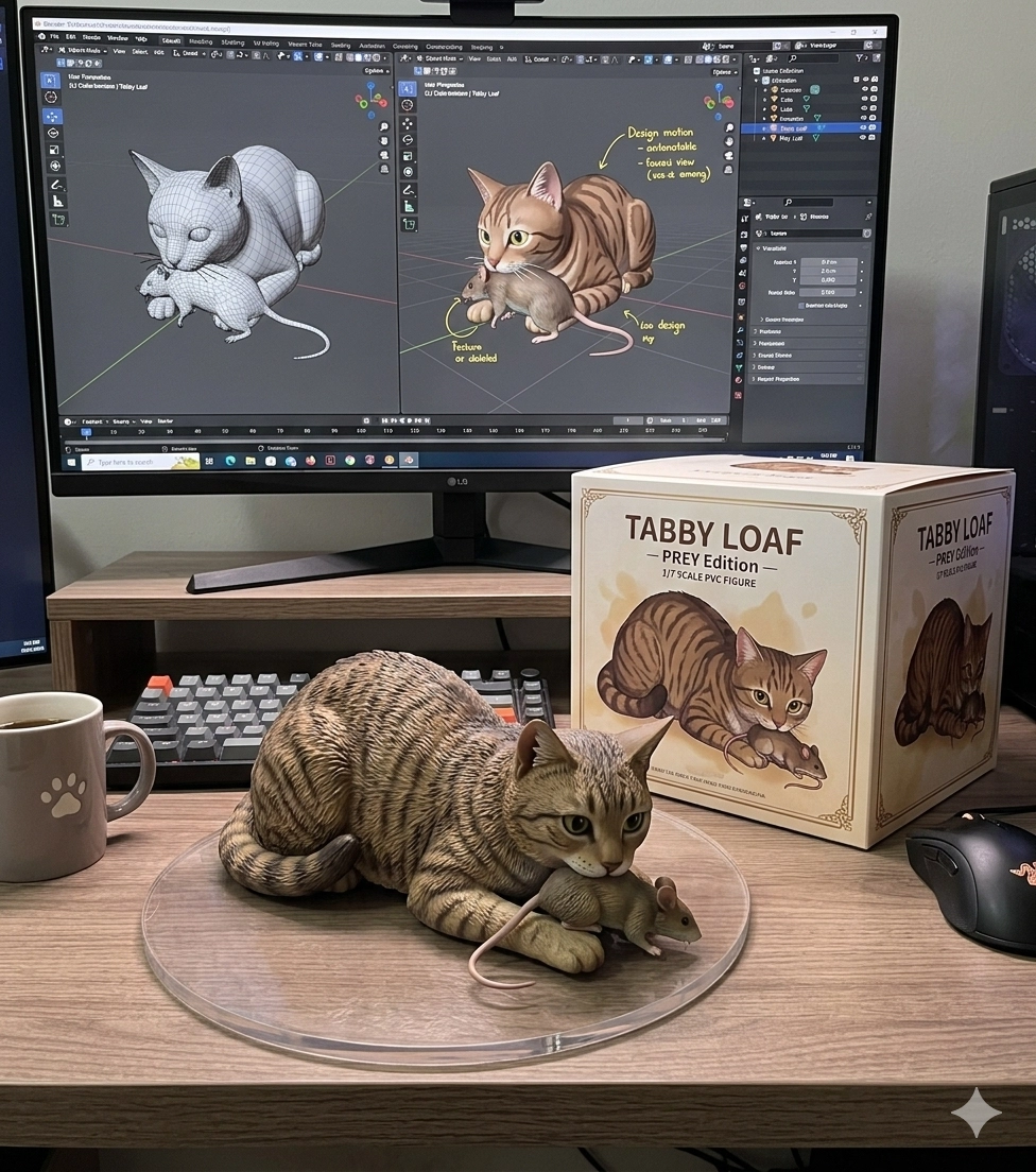 桌面上另外放置了鍵盤、滑鼠、咖啡杯,以及其模型盒,設計為市售收藏品風格,正面印有該角色的彩色動漫插圖,呈現完整的周邊商品氛圍。」
