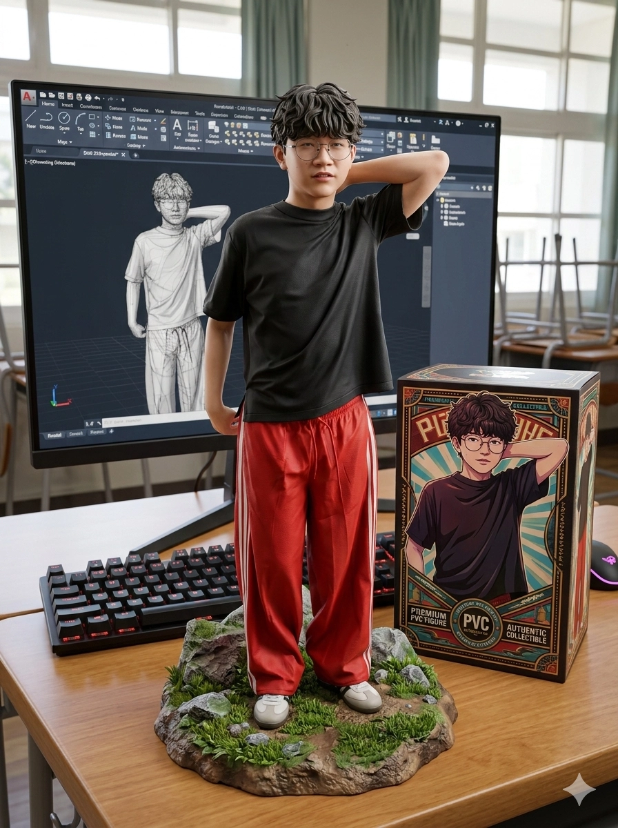 三、輸入「請用我提供的原圖,把圖片內主體變成電腦桌前的立體公仔。場景為一張教室書桌,上面擺放著一個1/7 比例的 PVC 公仔,角色以站立姿態呈現,並固定在逼真的山丘上,呈現出細緻逼真的風格收藏品質感。