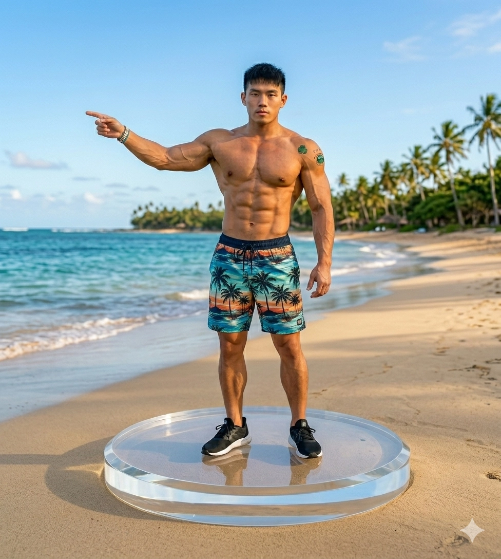 請用我提供的原圖,把圖片內主體變成海灘上的猛男。場景為海灘,角色以站立姿態呈現,人物不要戴口罩,也不