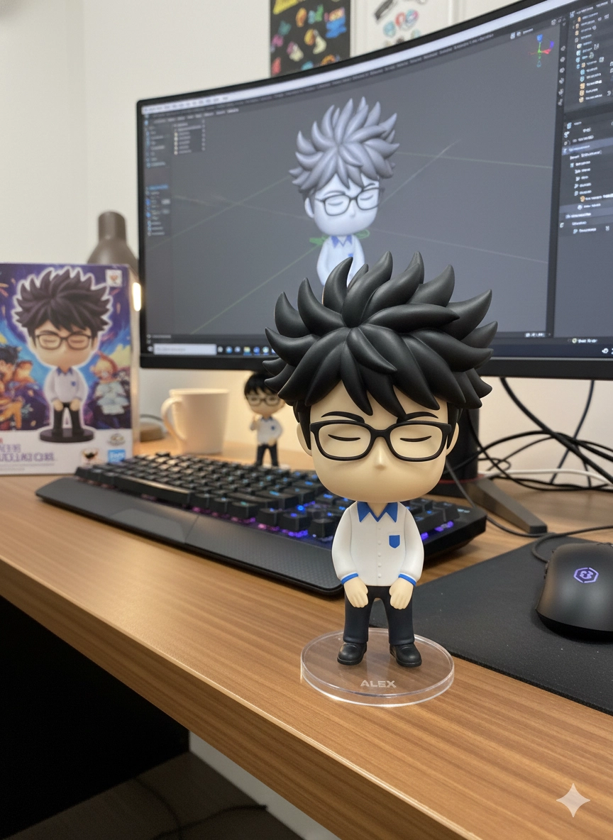 三、輸入「請用我提供的原圖,把圖片內主體變成電腦桌前的立體公仔。場景為一張教室書桌,上面擺放著一個1/7 比例的 PVC 公仔,角色以站立姿態呈現,穿著制服,並固定在逼真電腦桌,呈現出細緻逼真的風格收藏品質感。