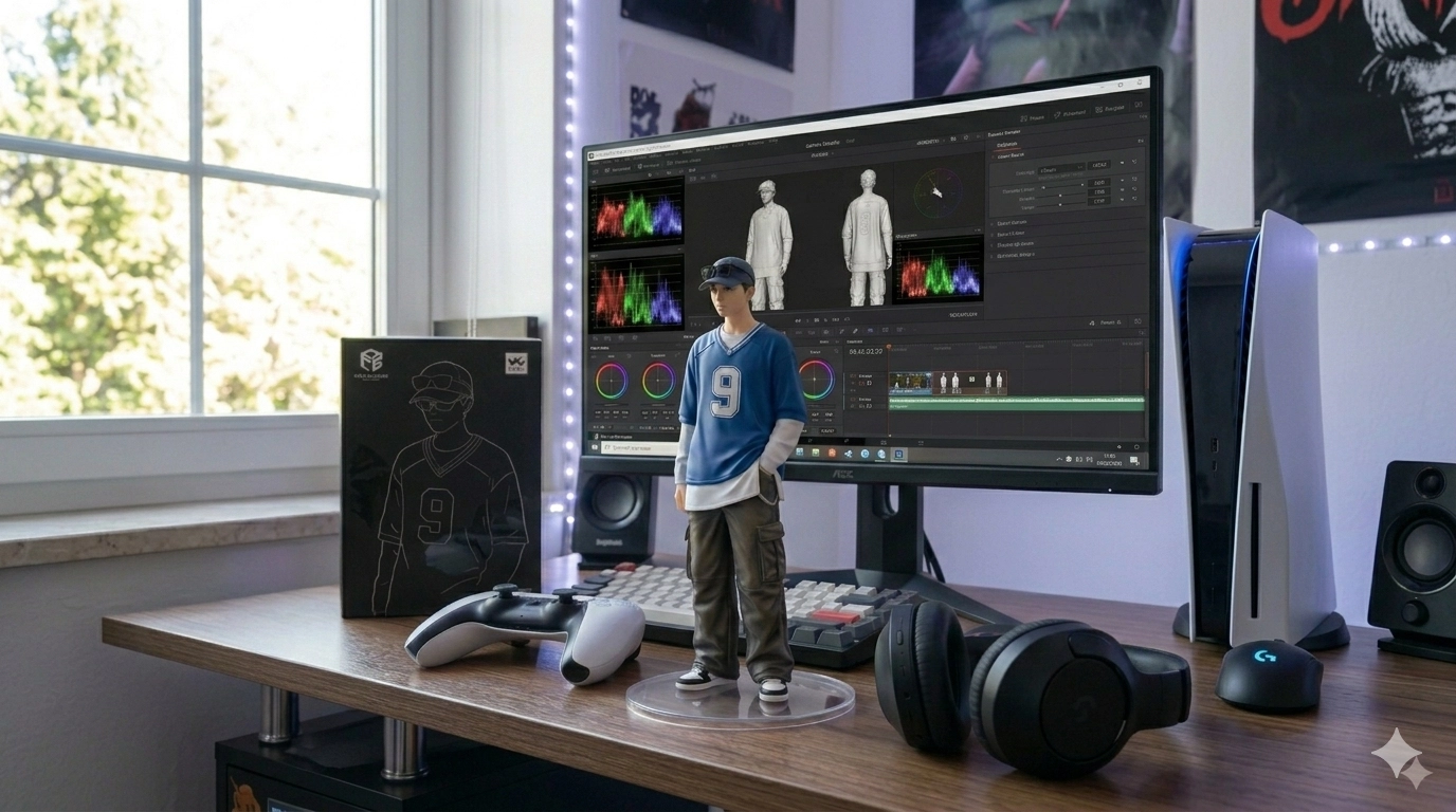 桌面上另外放置了鍵盤、滑鼠、ps5的遙控器和ps5、耳機,以及其模型盒,設計為市售收藏品風格,正面印有該角色的黑色系風格插圖,呈現完整的周邊商品氛圍。」