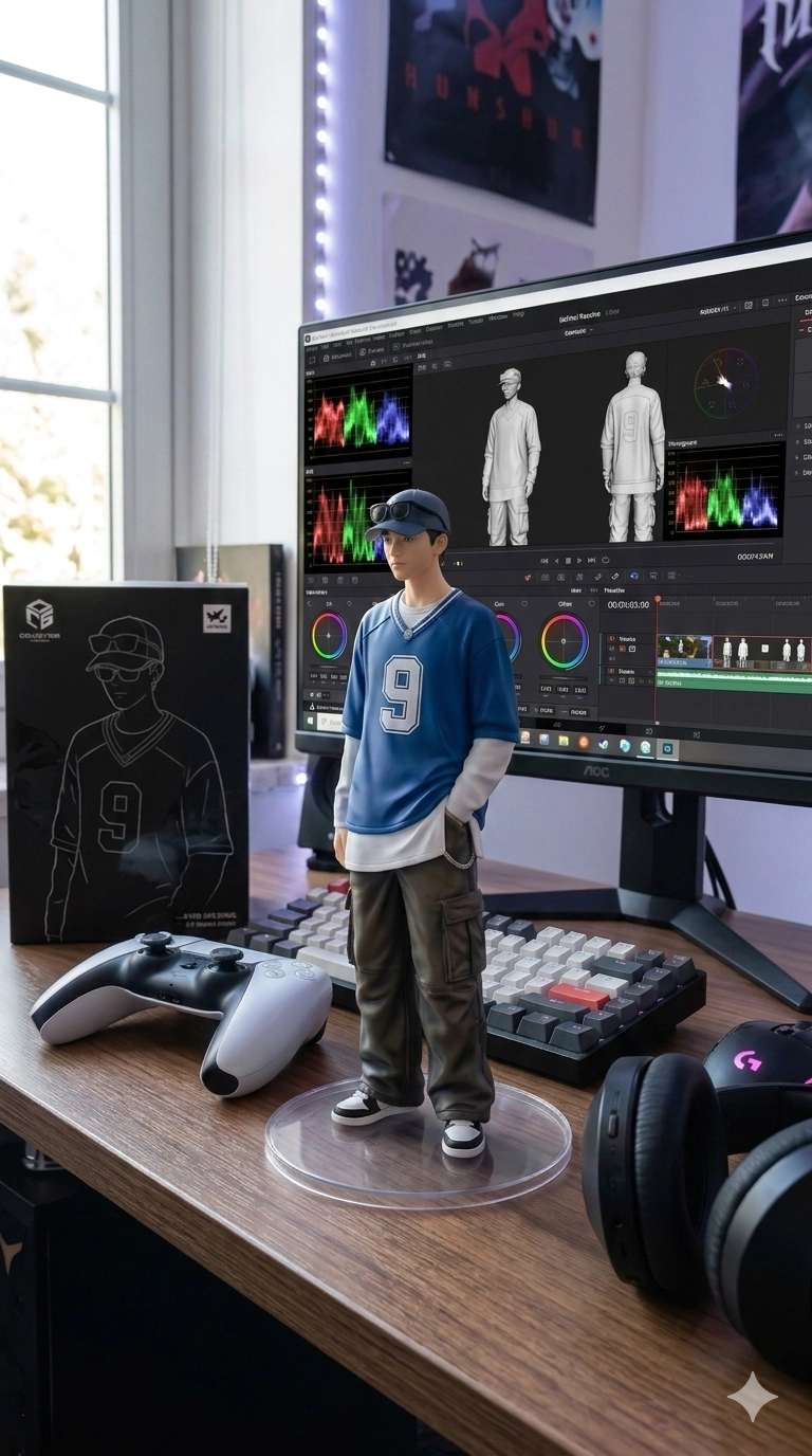 請用我提供的原圖,把圖片內主體變成電腦桌前的立體公仔。 場景為一張電腦書桌,上面擺放著一個1/7 比例的 PVC 公仔,角色以站立姿態呈現,並固定在透明圓形底座上,呈現出細緻逼真的動漫風格收藏品質感。