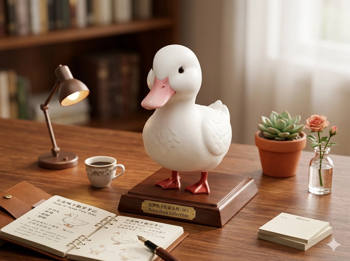 將一隻鴨子設計成「桌上展示模型」,做成精緻的收藏級公仔風格,比例略微Q版但保有真實鴨子的特徵。模型材質為高質感樹脂與霧面塗裝,細節清晰,可見羽毛紋理雕刻。鴨子站在圓形展示底座上,底座為木質紋理或簡約現代風格。