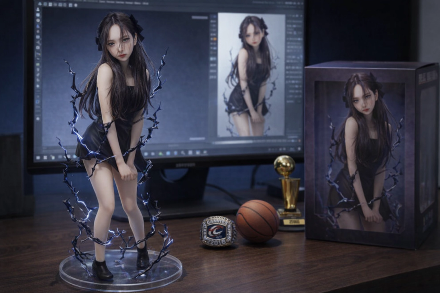 請用我提供的原圖,把圖片內主體變成電腦桌前的立體公仔。