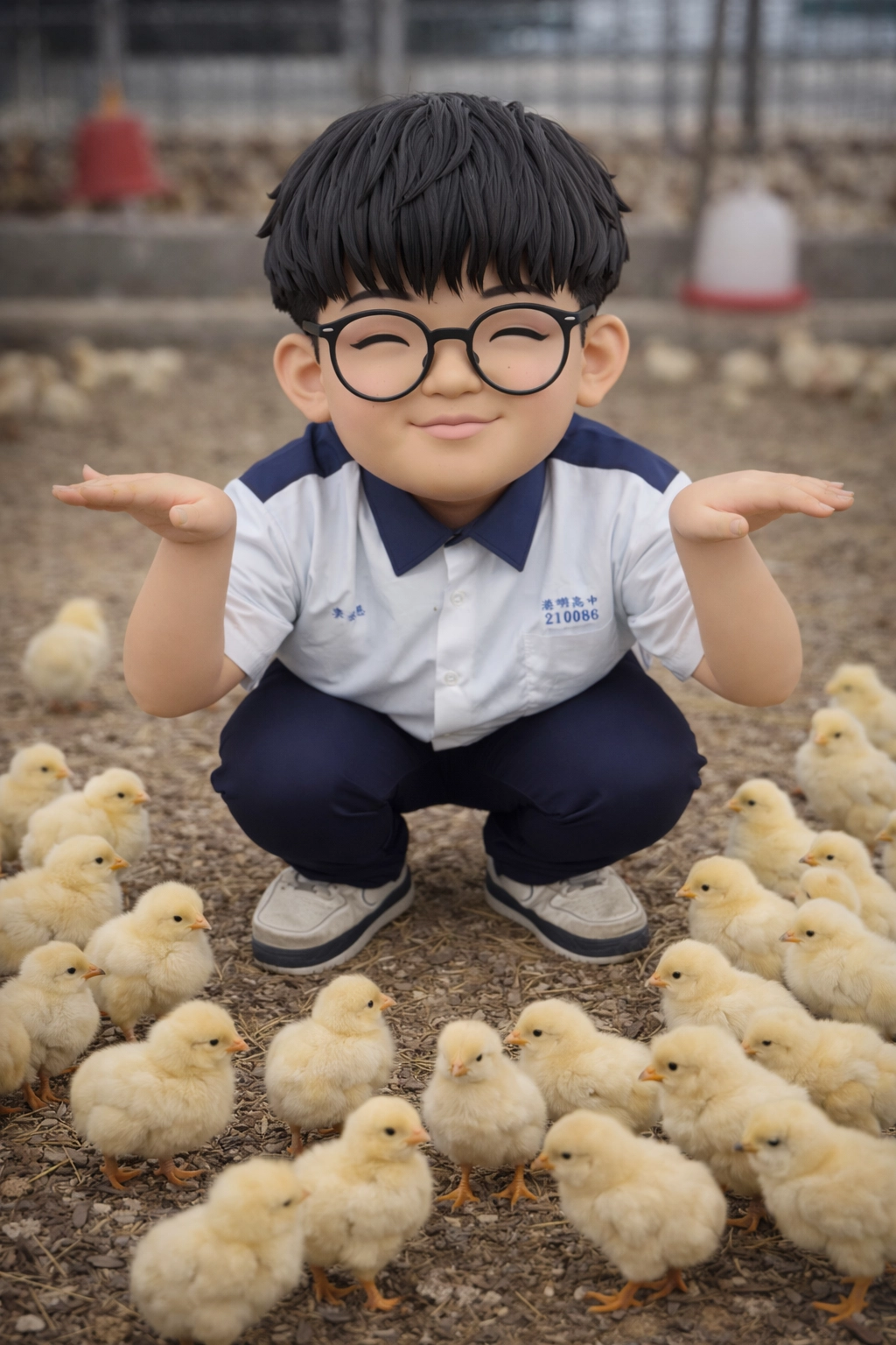 幫我把背景改成養雞場 把其他的人的腳去掉 在中間那個人周圍放一群小雞 再幫我把中間那個人做成公仔 動作不要變
