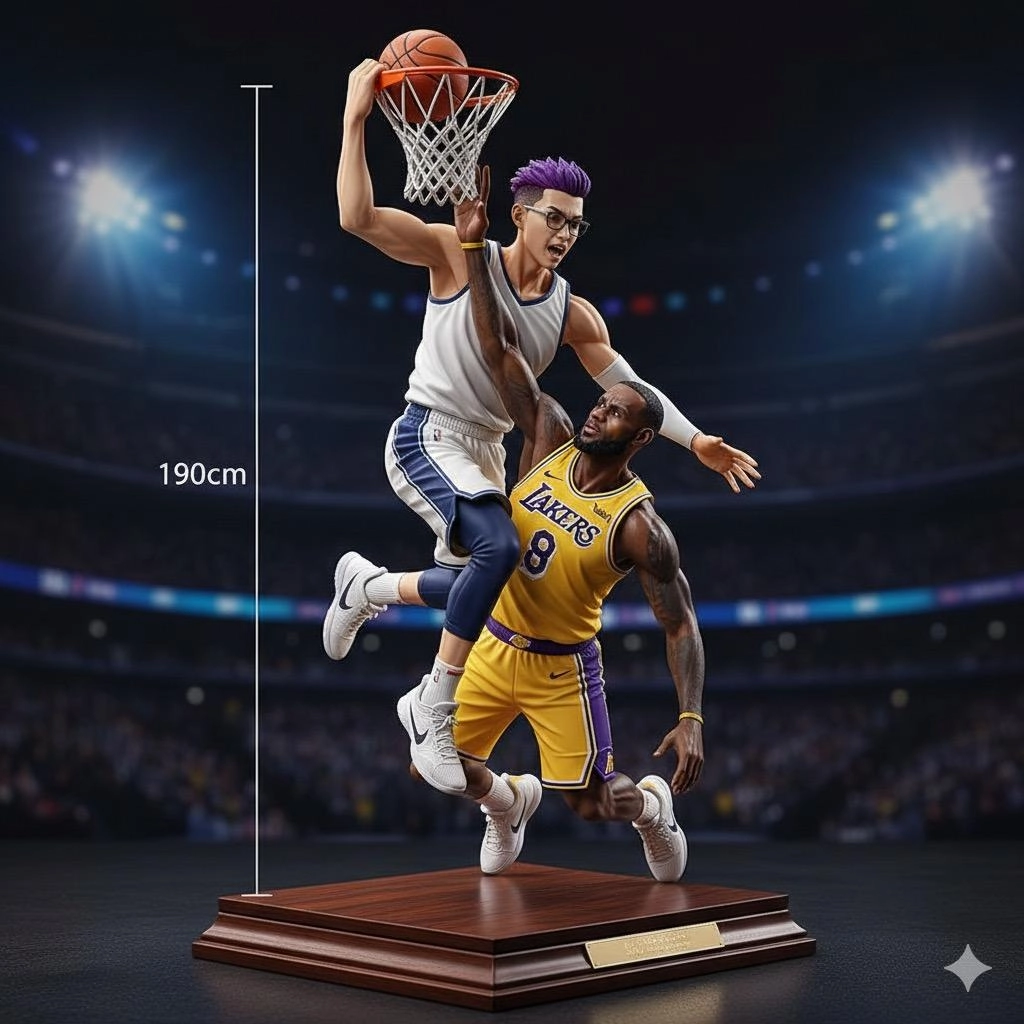 幫我將圖片的人和LeBronJames設計成一組公仔動作為第一個人隔扣第二個人第一個人身高190第二