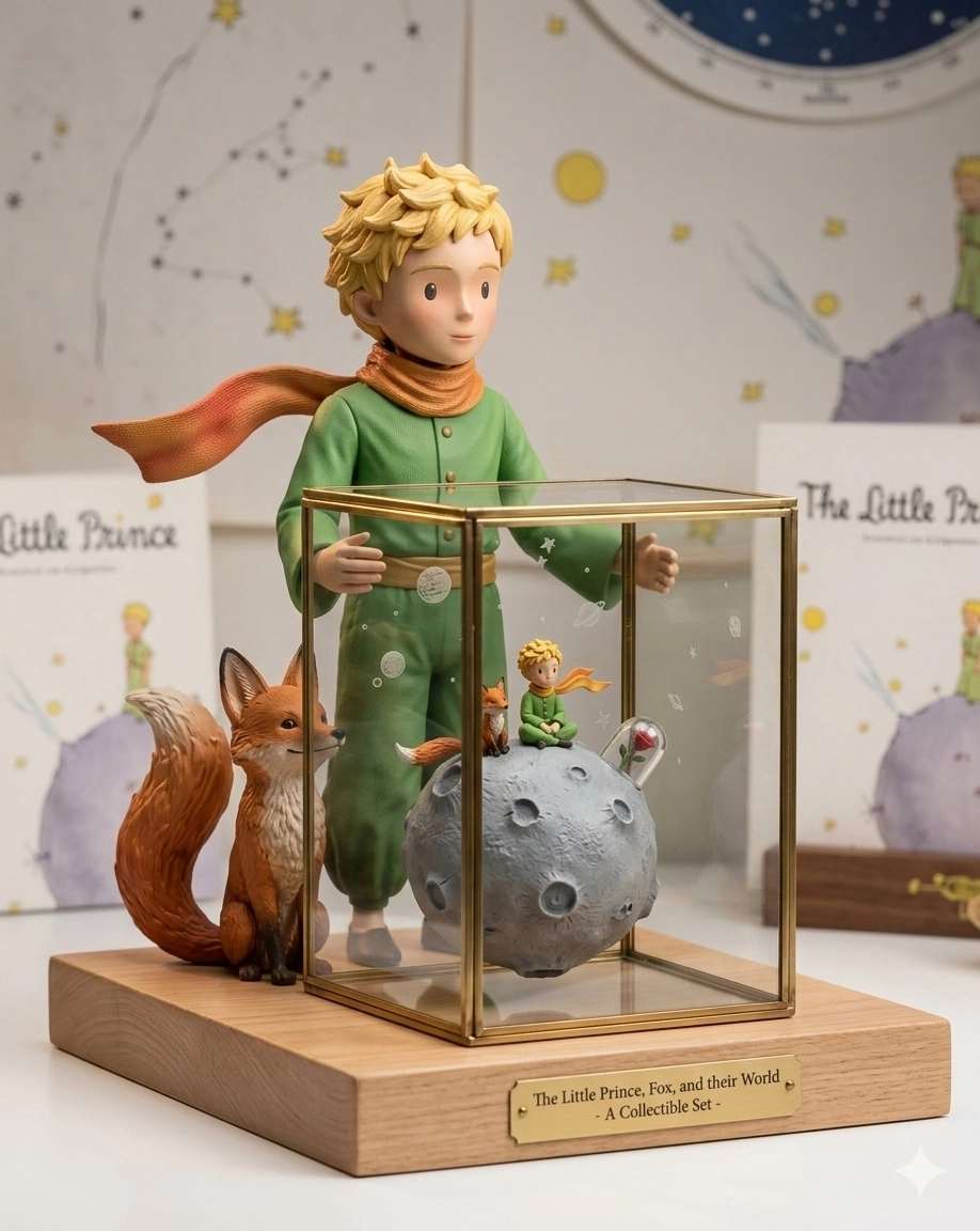 這個大公仔由圖片中的小王子和狐狸組成,它們一起拿著小公仔。