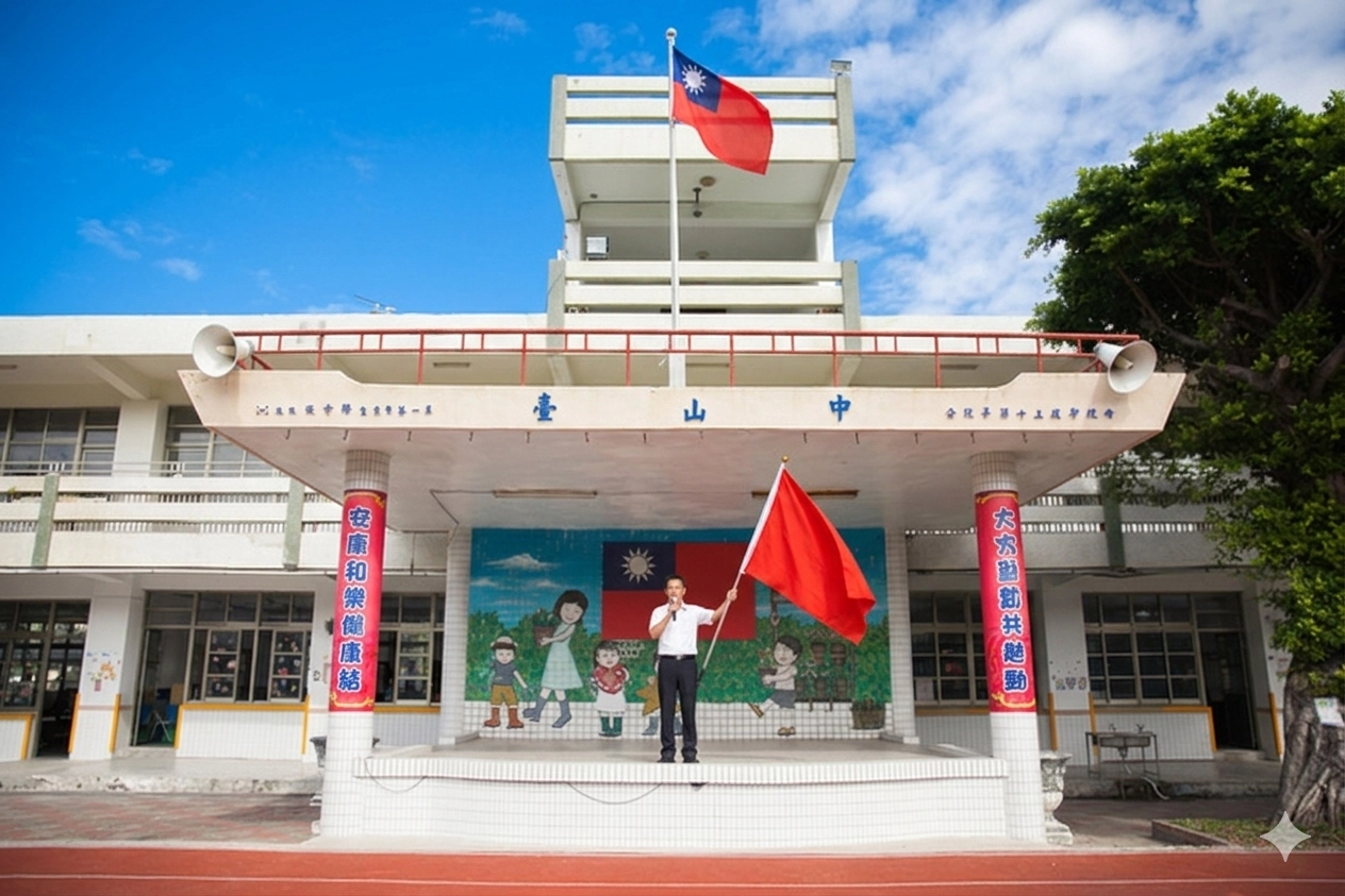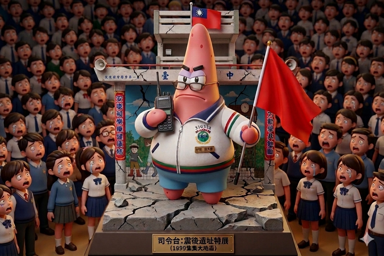 幫我把這張圖片生成成一位立體的派大星,他幻想自己是一位高中的校長,鎮定地站在司令台(就是立體公仔的底