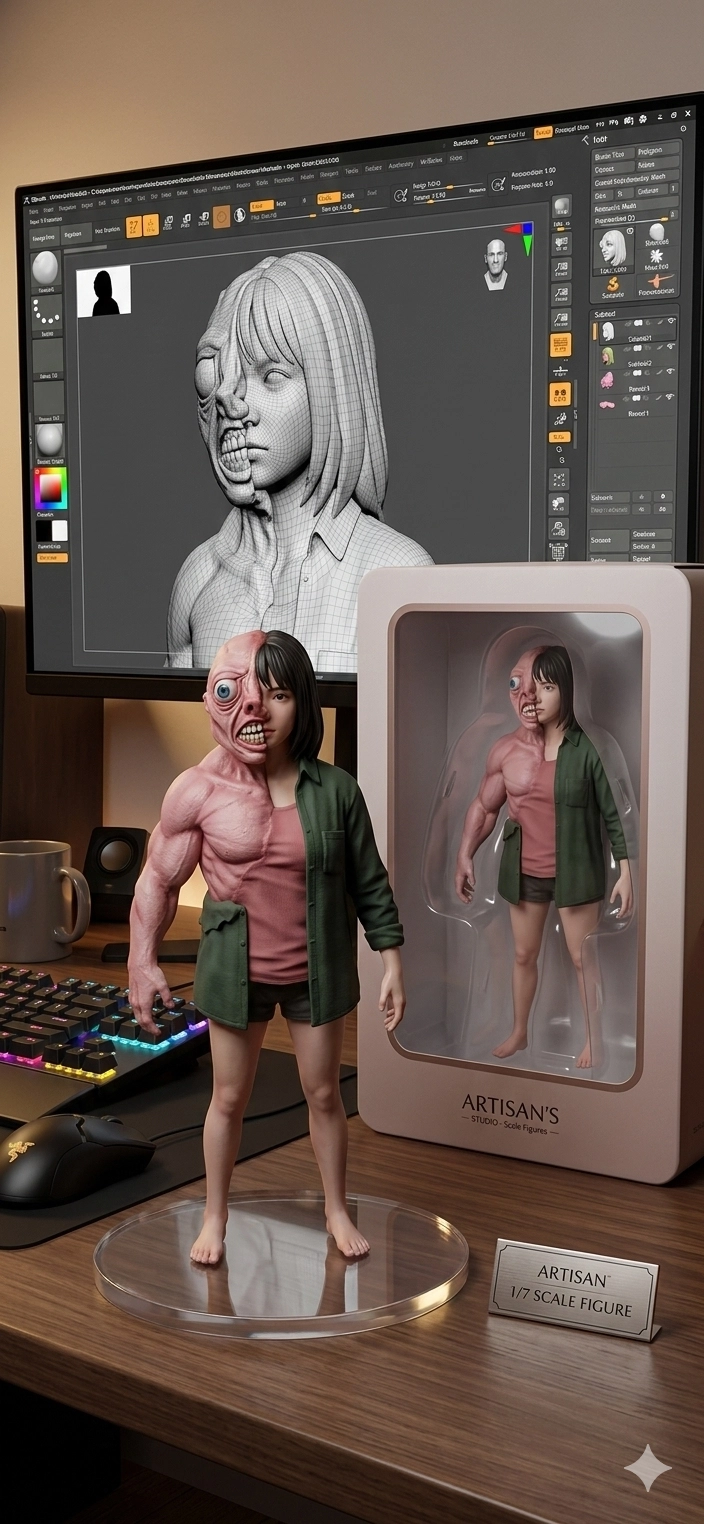 「製作一款1/7比例的商業化角色模型,以寫實風格呈現,並置於真實環境中。模型放在電腦桌上,底座為圓形透明壓克力,且底座上沒有任何文字。電腦螢幕畫面顯示的是此模型在ZBrush中的建模過程。在電腦螢幕旁,擺放著一個帶有圓角設計的包裝盒,正面有透明視窗,可以清楚看到裡面的模型。」