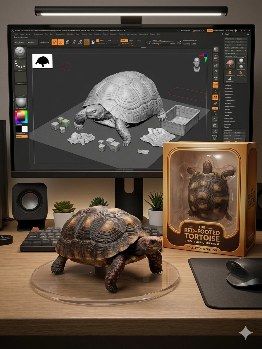 製作一款1/7比例的商業化角色模型,以寫實風格呈現,並置於真實環境中。模型放在電腦桌上,底座為圓形透明壓克力,且底座上沒有任何文字。電腦螢幕畫面顯示的是此模型在ZBrush中的建模過程。在電腦螢幕旁,擺放著一個帶有圓角設計的包裝盒,正面有透明視窗,可以清楚看到裡面的模型。