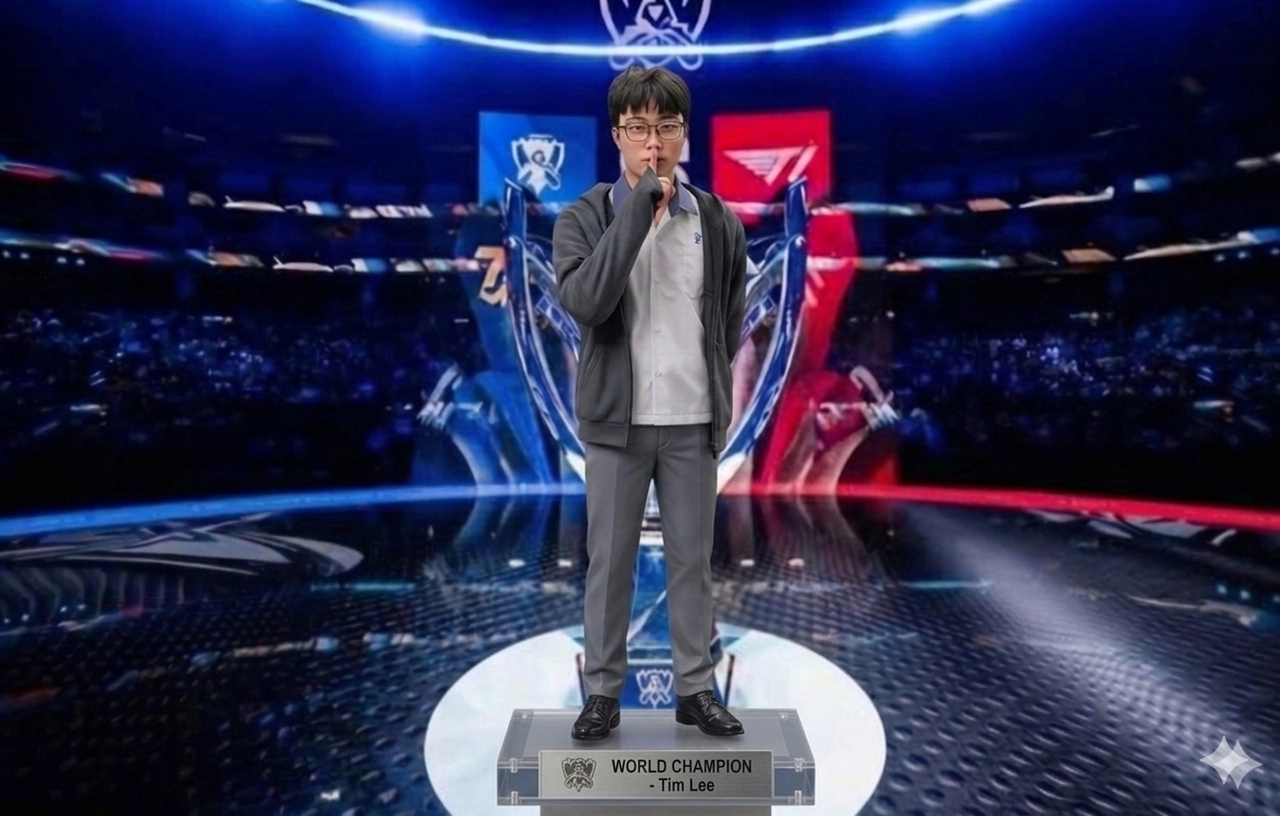 請使用我提供的照片幫我進行修改,將他做成一個真實比例1/7的等身公仔。把照片中的人完整的包括下半身真實的呈現出來,上半身是制服,所以下半身幫我穿制服褲子配上皮鞋,外套一樣幫我保留,手勢跟眼神等等都不要改變。然後這個公仔要站在一個頒獎臺,是一個只有他一個人的頒獎臺,頒獎臺上面的文字我想要是「世界冠軍-Tim Lee」並且使用英文呈現,背景就像我提供的那樣,是一個電競比賽的背景。