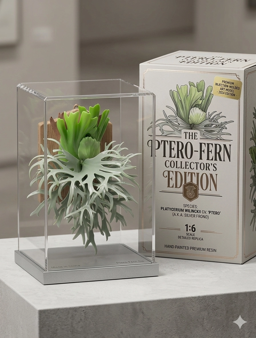 原圖為一株鹿角蕨圖片,請Gemini作成模型,輸入指令為:請將我提供的圖片,將圖片中的鹿角蕨作成塑膠模型,並用展示盒展示,並附上模型外盒。