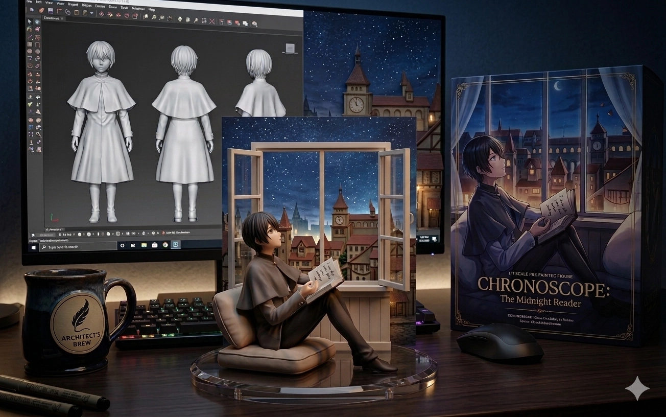 場景為一張電腦書桌,上面擺放著一個1/7 比例的 PVC 公仔和背景(包含夜色),並固定在透明圓形底座上,呈現出細緻逼真的寫實風格收藏品質感。