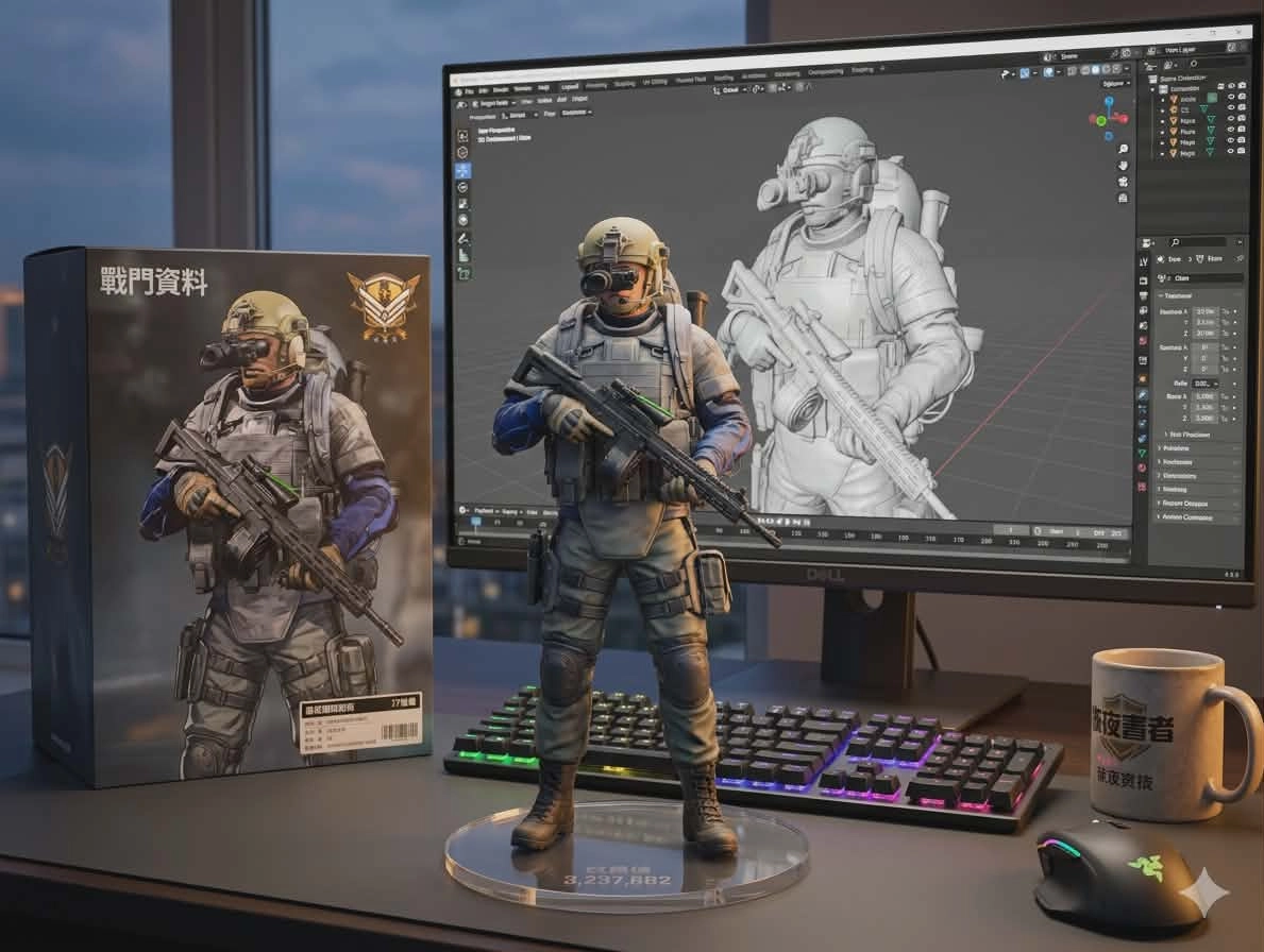 把模型放在電腦桌上,桌上有一台電腦,電腦上顯示模型的設計圖。