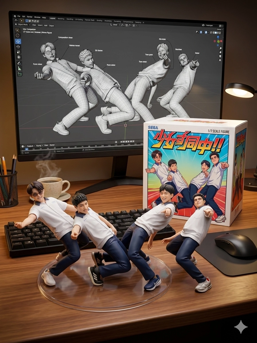 :「請用我提供的原圖,把圖片內主體變成電腦桌前的立體公仔。