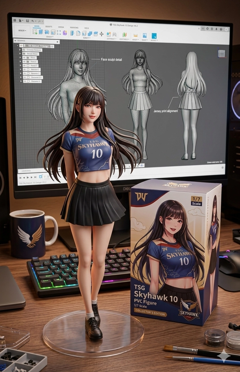 場景為一張電腦書桌,上面擺放著一個 1/7 比例的 PVC 公仔,角色以站立姿態呈現,並固定在透明圓形底座上,呈現出細緻逼真的動漫風格收藏品質感。