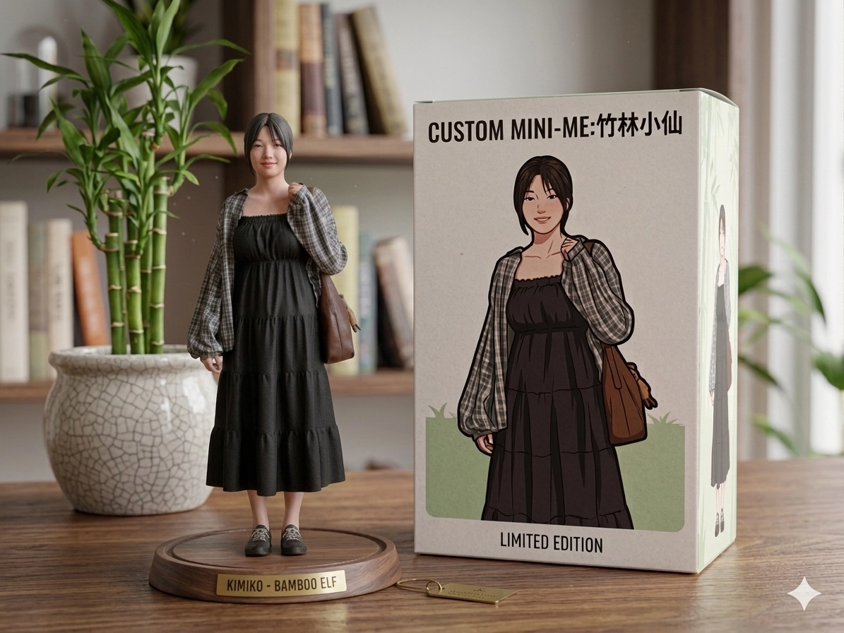 給Gemini的指示幫我做我的立體公仔照片,要很像現實的那種,然後後面要放公仔盒子,底部加個木頭底座