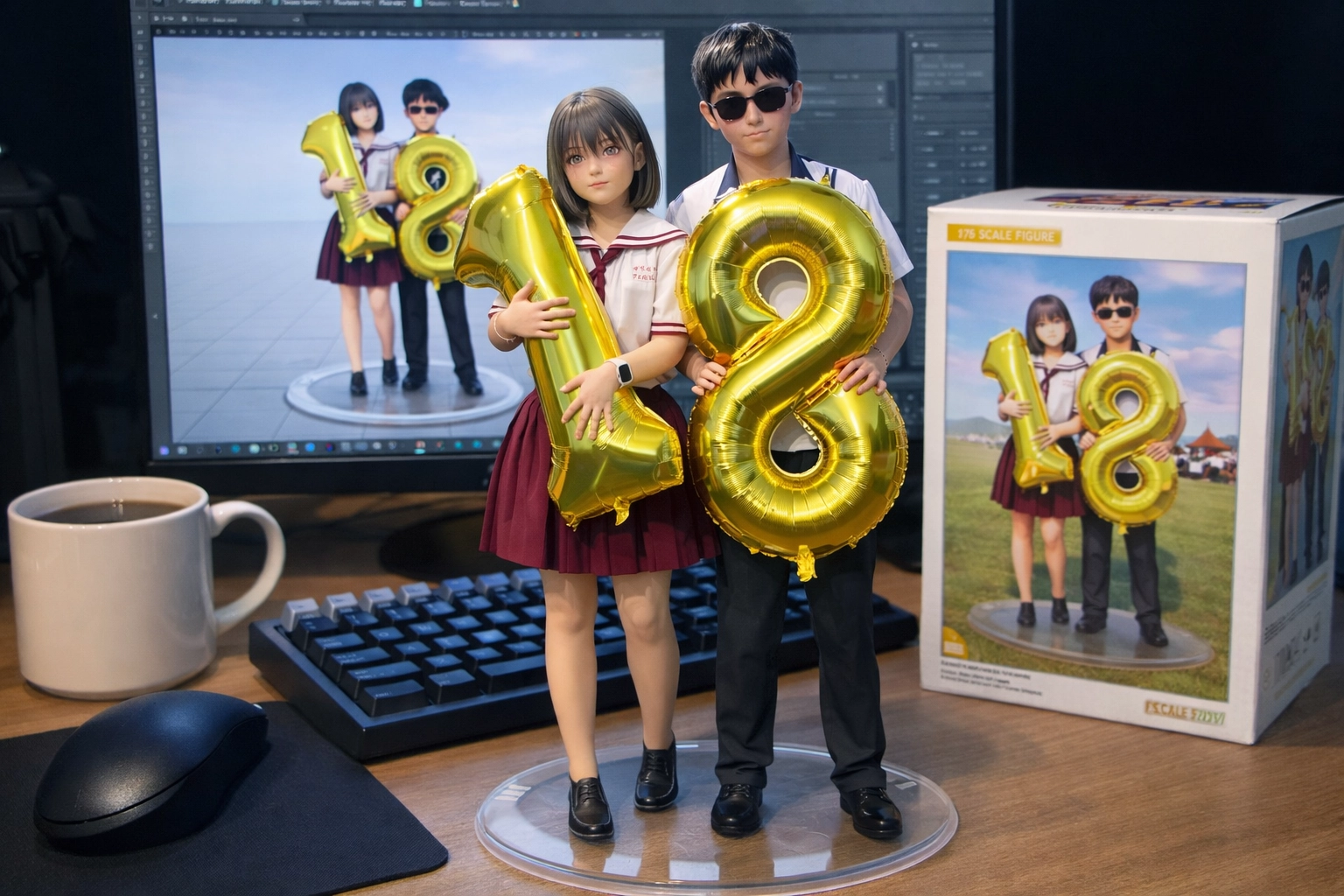 桌面上另外放置了鍵盤、滑鼠、咖啡杯,以及其模型盒,設計為市售收藏品風格,正面印有該角色的彩色動漫插圖,呈現完整的周邊商品氛圍。