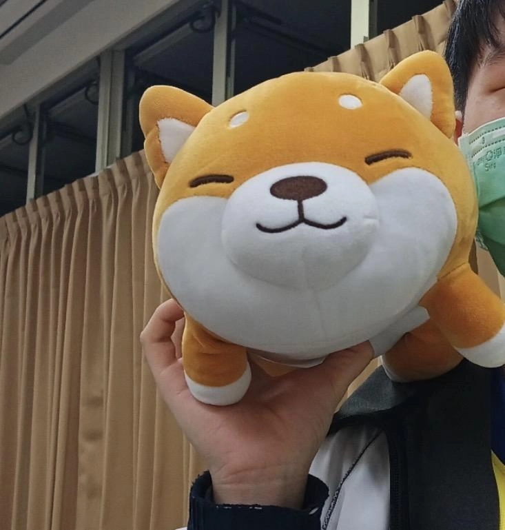 桌面上另外放置了鍵盤、滑鼠,桌面顏色是柴犬的顏色、風格是可愛,以及其模型盒,設計為市售收藏品風格,正面是透明的可以看到裡面的公仔,盒子顏色是柴犬的土黃色跟白色配色