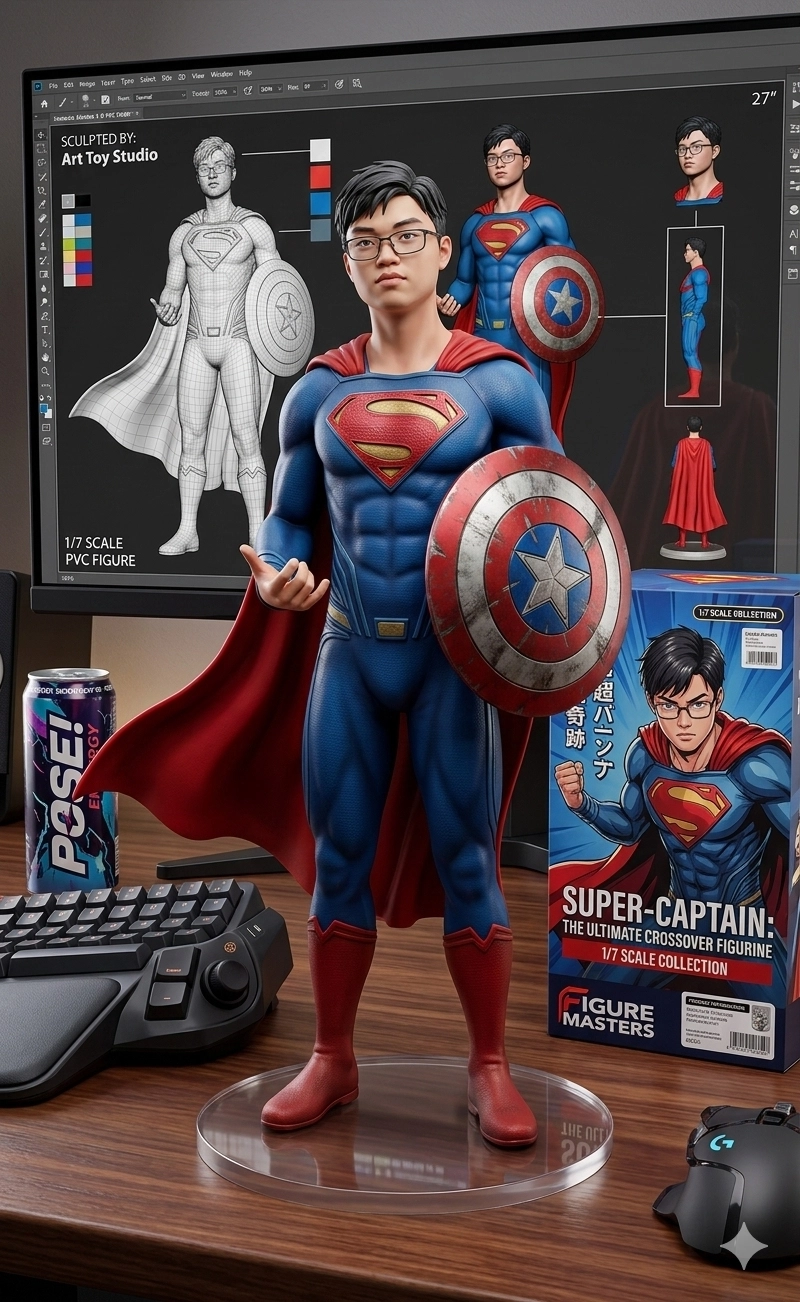 在公仔的背後是一台電腦螢幕,螢幕上顯示該角色的 3D 設計圖,就像有人正在進行設計過程。人物身穿超人的衣服手拿美國隊長的盾牌。