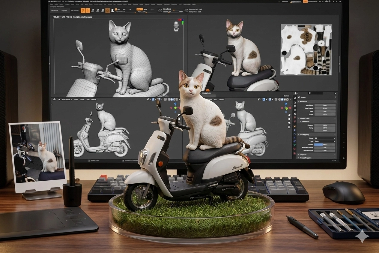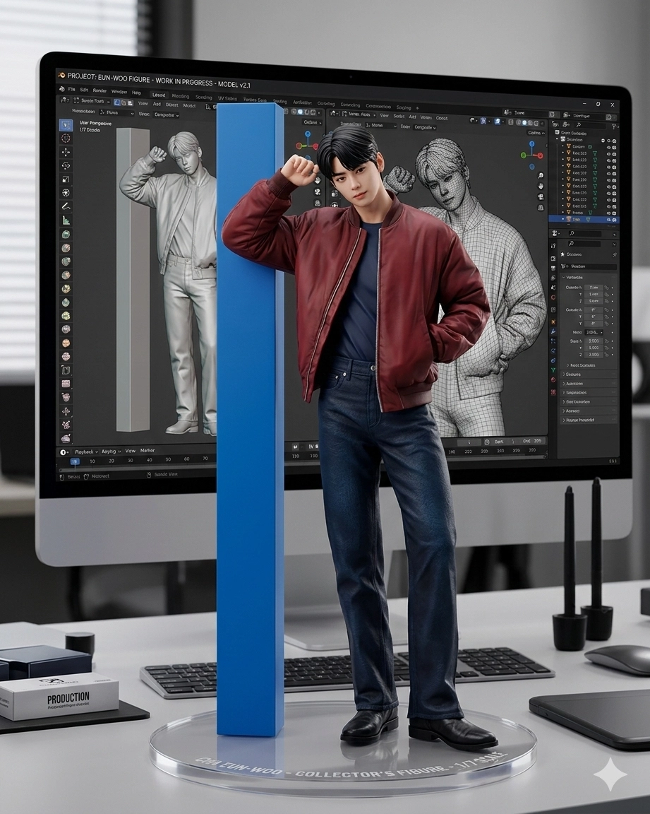 在公仔的背後是一台電腦螢幕,螢幕上顯示該角色的 3D 設計圖,就像有人正在進行設計過程