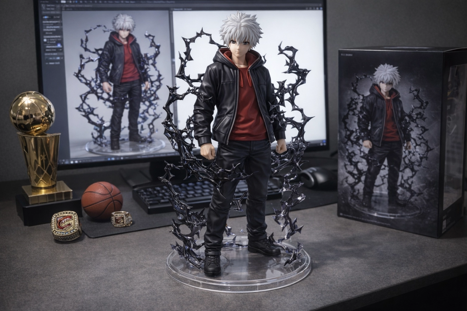 請用我提供的原圖,把圖片內主體變成電腦桌前的立體公仔。