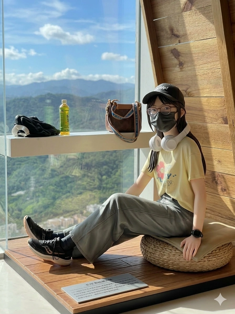 將照片中的人物射程1/7比例的PVC造型公仔,保持照片中的坐姿與整體構圖,角色維持坐在窗邊的放鬆姿勢。