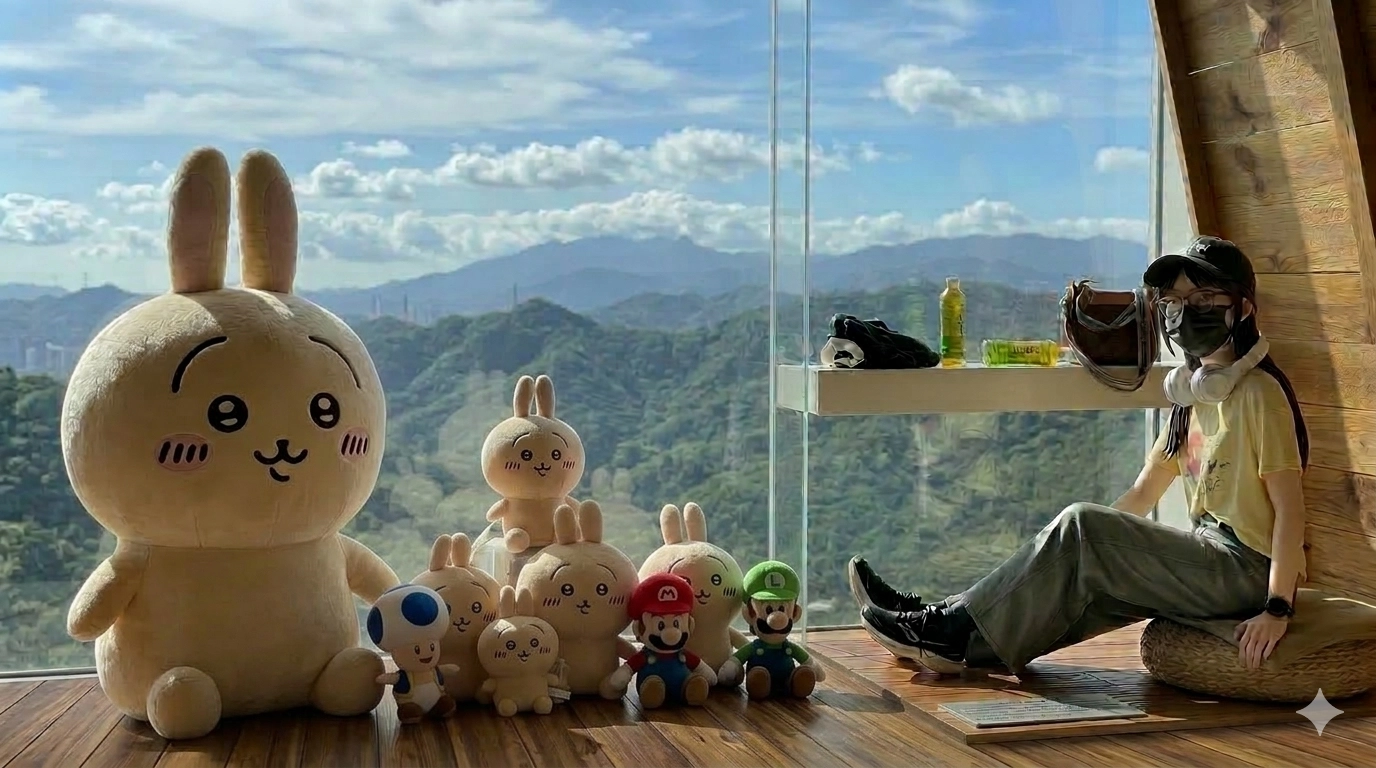 將木質地板與落地窗延伸,再於左側放上一隻大型烏薩奇娃娃。