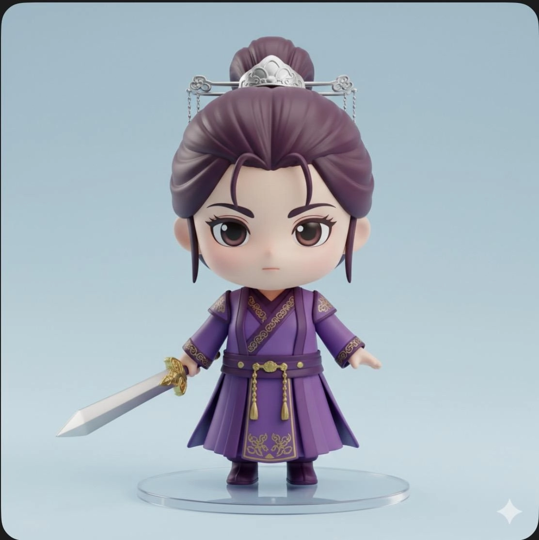 幫我生成一個3D立體公仔拿著劍站在透明圓盤上系統能從局部推算出未見的部分,例如全身模樣,還能改變動作