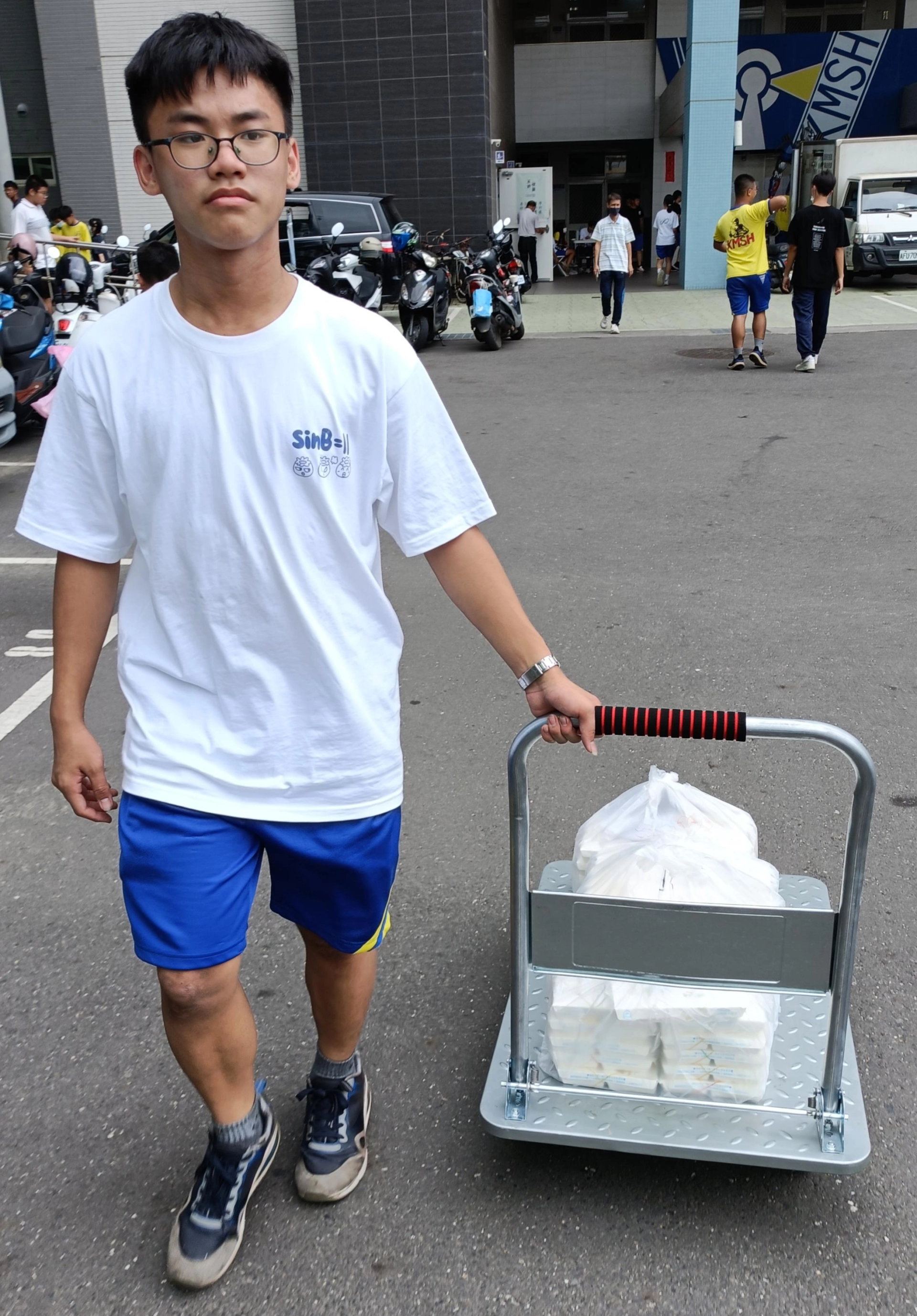 製作圖片中人物的模型,不要有推車,並在後面加上一個有日光的窗戶,再放上一個珍珠奶茶杯