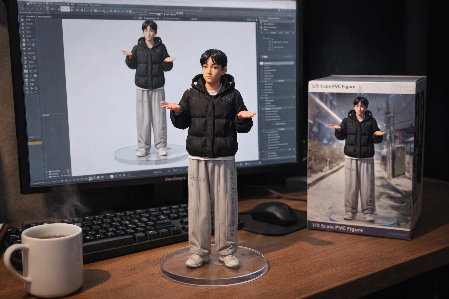 輸入「請用我提供的原圖,把圖片內主體變成電腦桌前的立體公仔。場景為一張電腦書桌,上面擺放著一個1/7