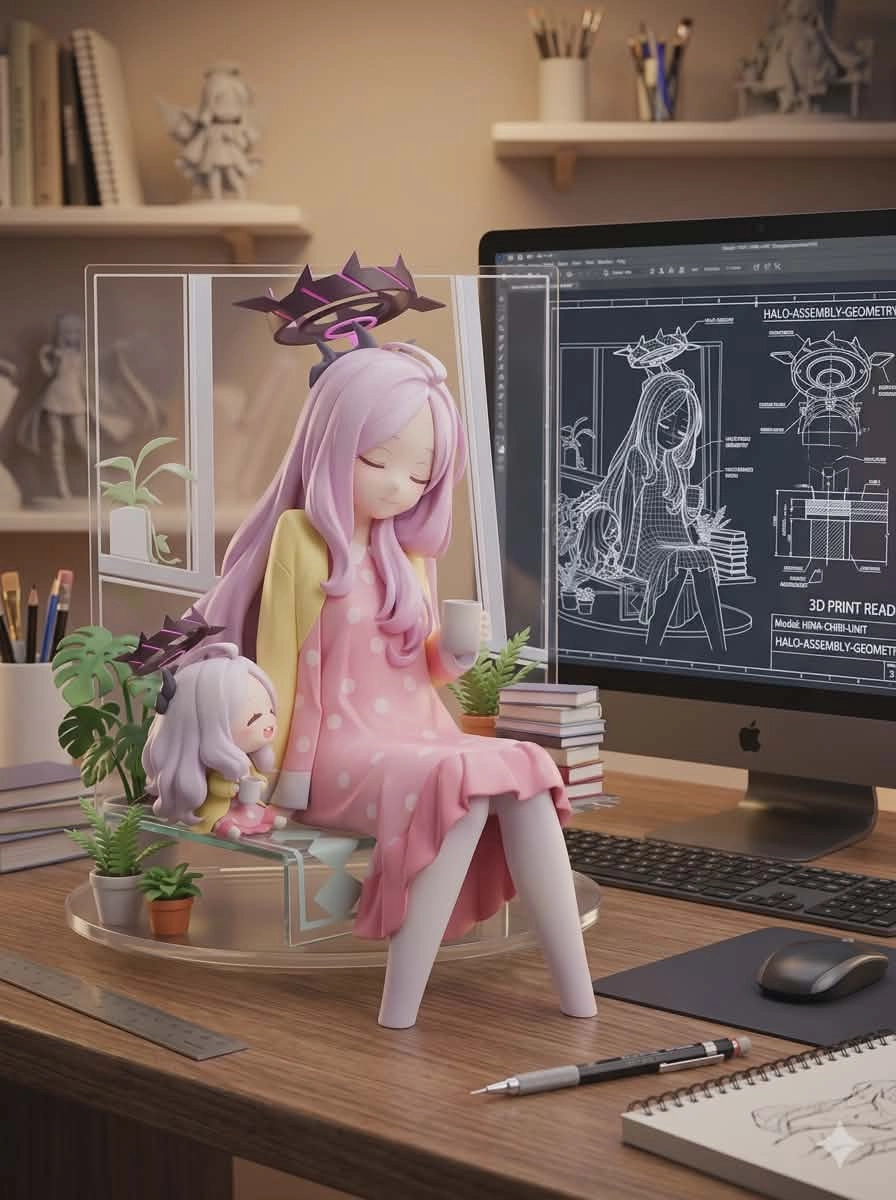 指令:步驟一:請幫我依照圖片生成一個3D的公仔步驟二:幫我把公仔放在桌上,桌上有一台電腦,電腦上顯示