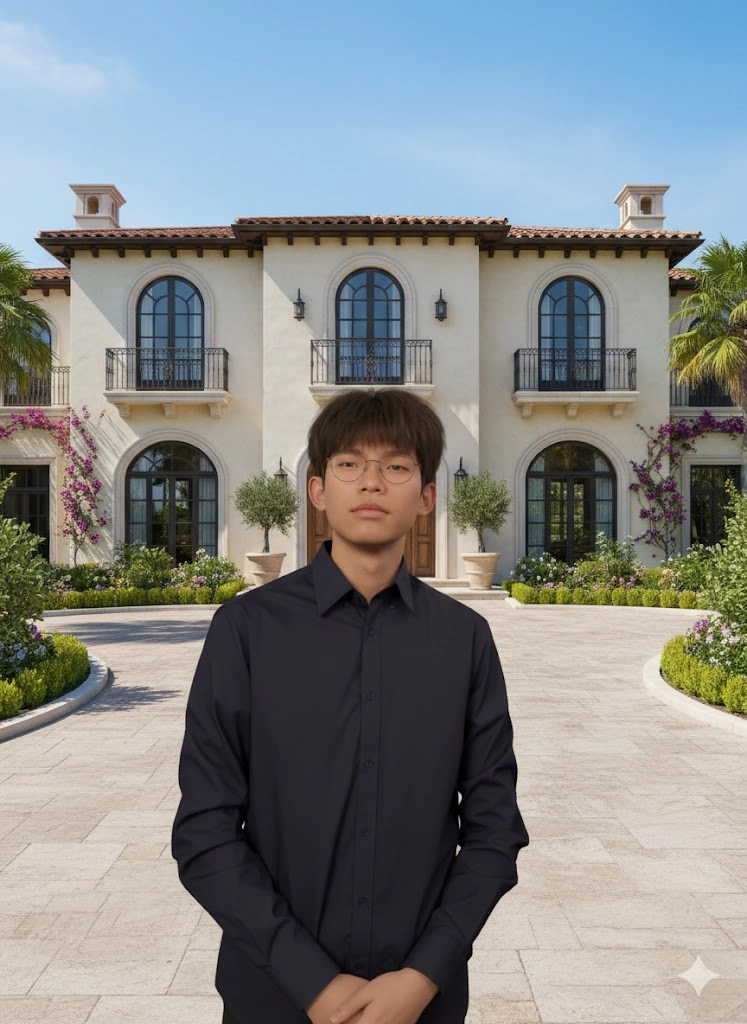 輸入指令:請參考年輕男子專業時尚模特兒肖像。將我變成穿著一件高品質、材質筆挺的黑色扣領正式襯衫的模型小人,表情自信,站在一座豪華地中海風格別墅前的寬闊鋪石車道上。背景擁有壯麗的建築設計,包含拱形窗戶、優雅的陽台,以及長滿棕櫚樹的花園。環境中有晴朗的陽光,帶有柔和的自然光線。畫面呈現人像鏡頭拍攝,希望能具備極致細膩的皮膚。