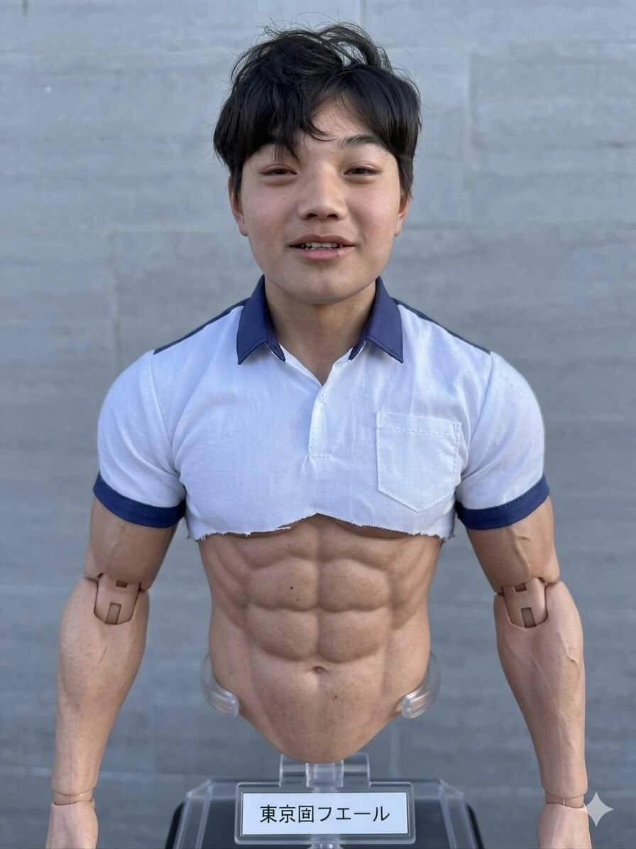幫我把照片裡的人做成公仔並且生成身體變成肌肉男