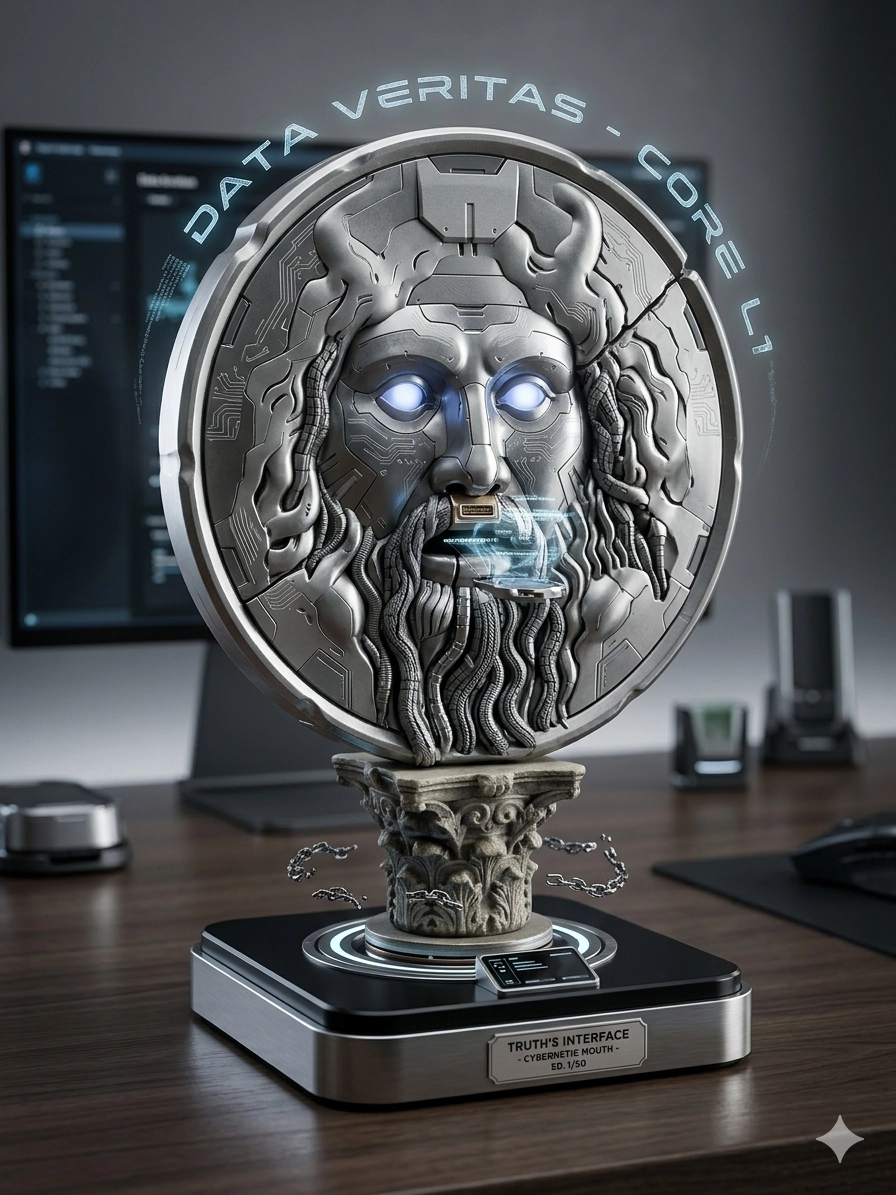 幫我以真理之口為主題,幫我生成一個具有科幻意境的桌上型公仔
