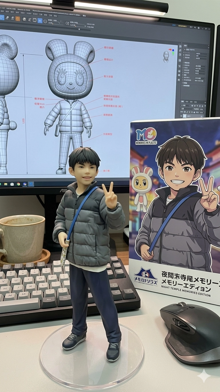 在公仔的背後是一台電腦螢幕,螢幕上顯示該角色的 3D 設計圖,就像有人正在進行設計過程。