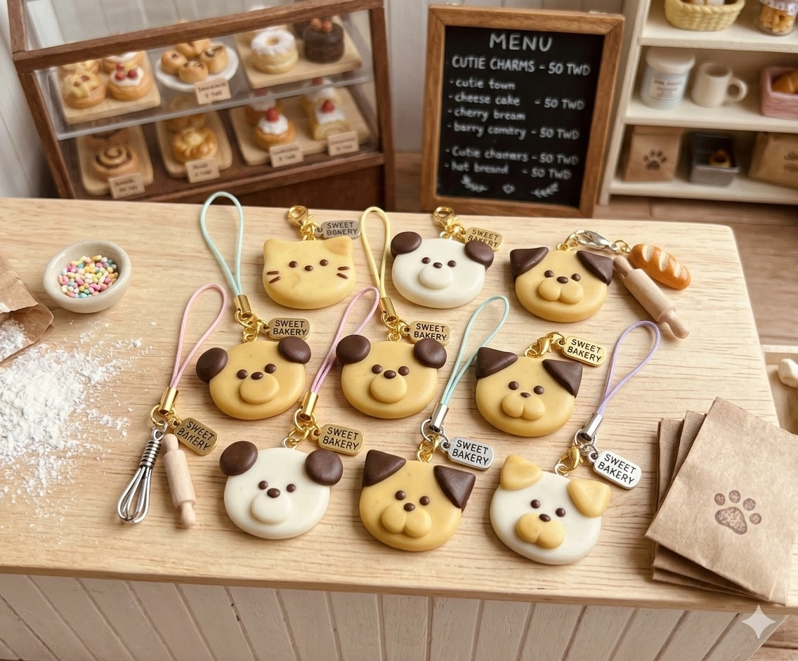 1.這些是我做的餅乾,請幫我以這些圖案做成風格可愛的模型吊飾,餅乾分別為白貓、黑貓、熊、狗,背景要與烘焙店有關,整體溫馨的感覺。