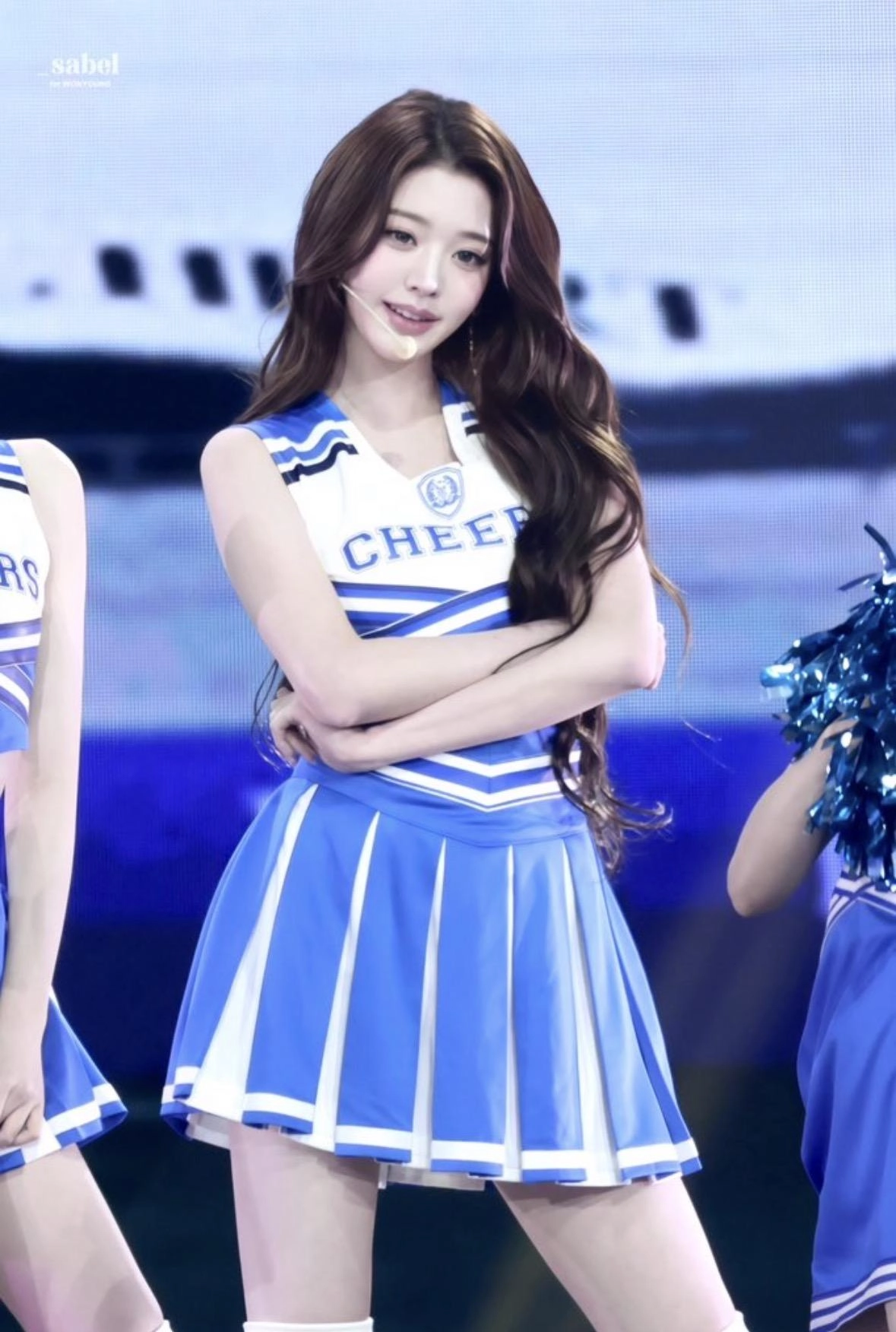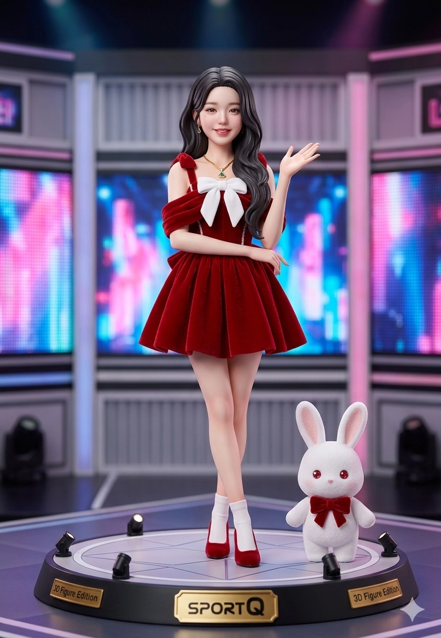 請幫我做成一個3D立體公仔,旁邊要有一隻小白兔,背景要舞台,這位女生的腳要交叉