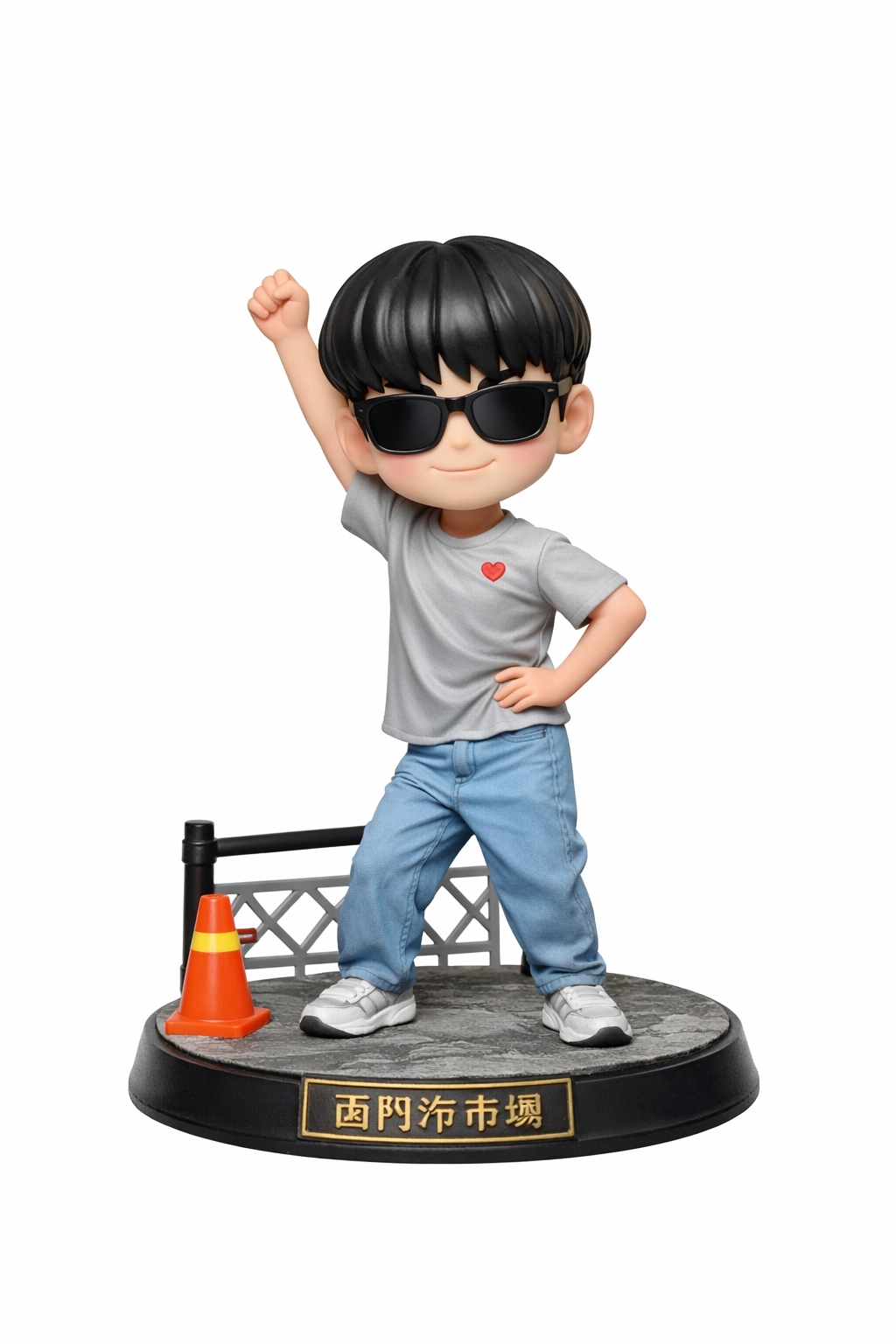 幫我把照片的人做成公仔Ai:有墨鏡的照片幫我把墨鏡去掉並加上背景Ai:最後呈現