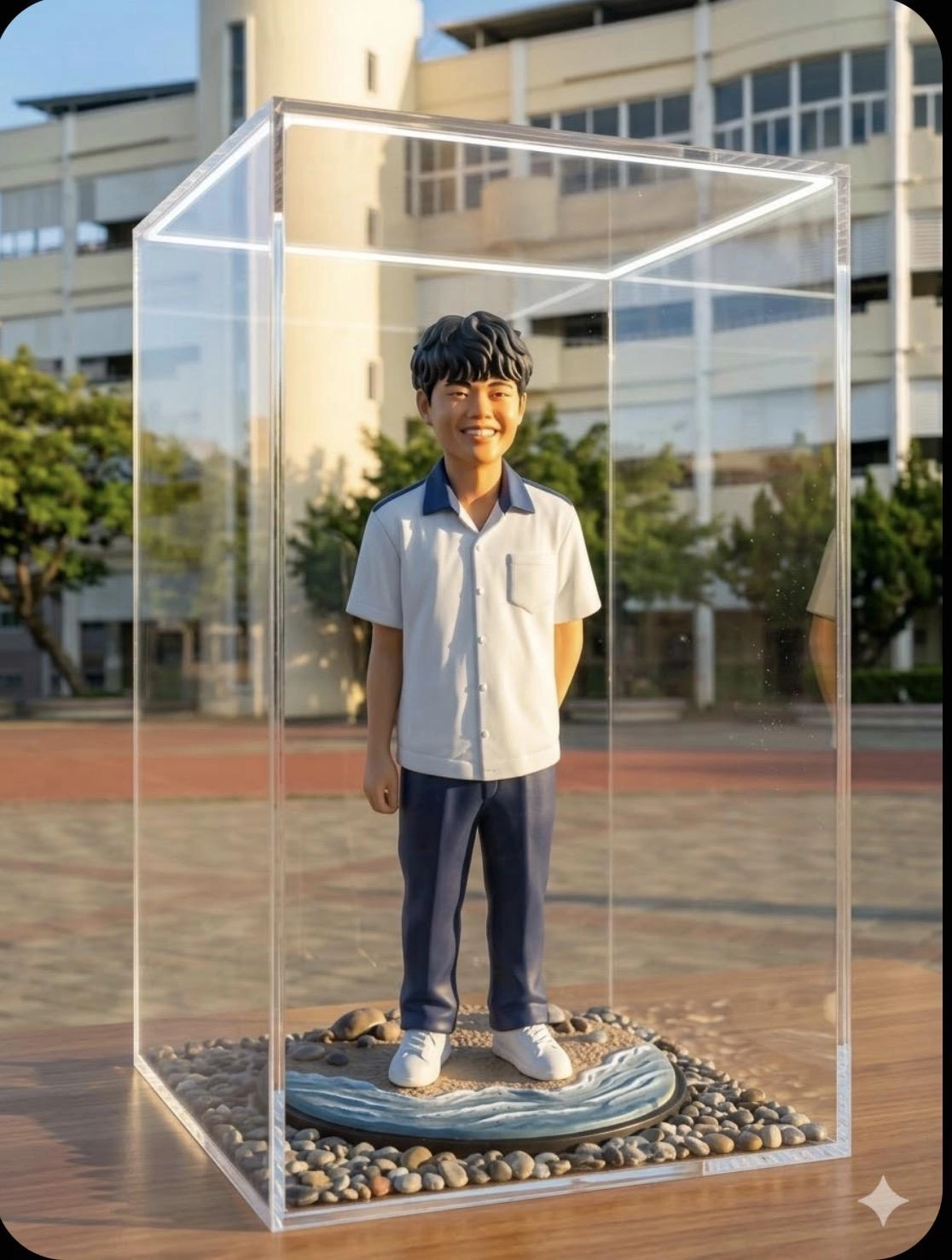 請幫我生成公仔照片,並且將我衣服的字都刪掉,背景改成學校,用一個透明展示盒
