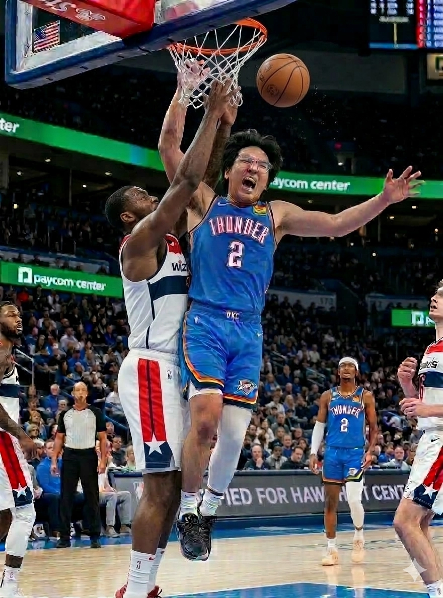 把圈起來的人帶入一場nba比賽,身穿雷霆隊2號球衣球衣,改成刻意製造犯規的動作,加一個防守者擋在他前