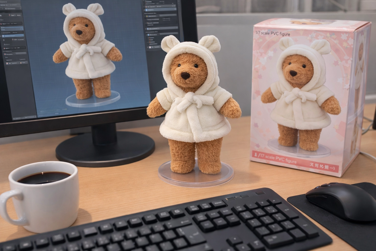 請用我提供的原圖,把圖片內主體變成電腦桌前的立體公仔。