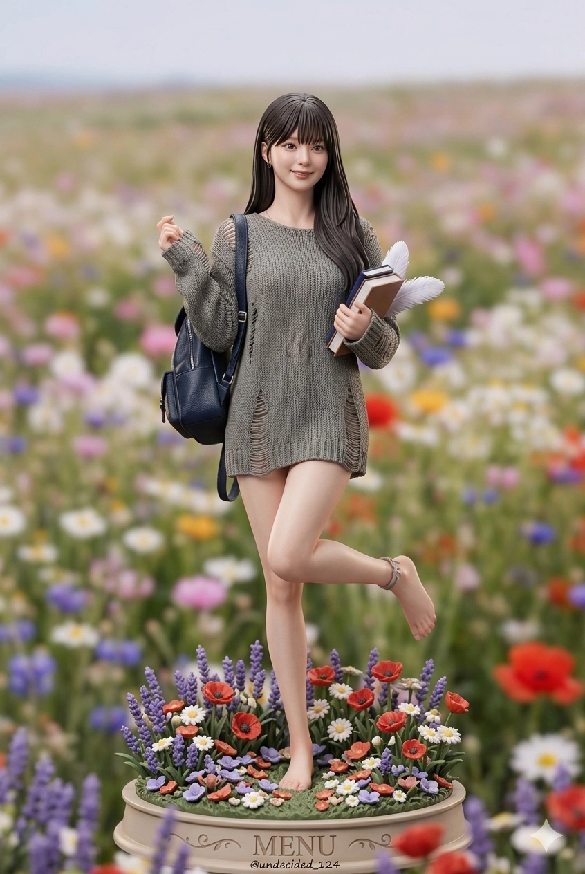 請幫我依照這張照片中的人做成一個3D立體公仔,一隻腳要往旁邊勾起來,另一隻站立,手的姿勢隨意,背景要
