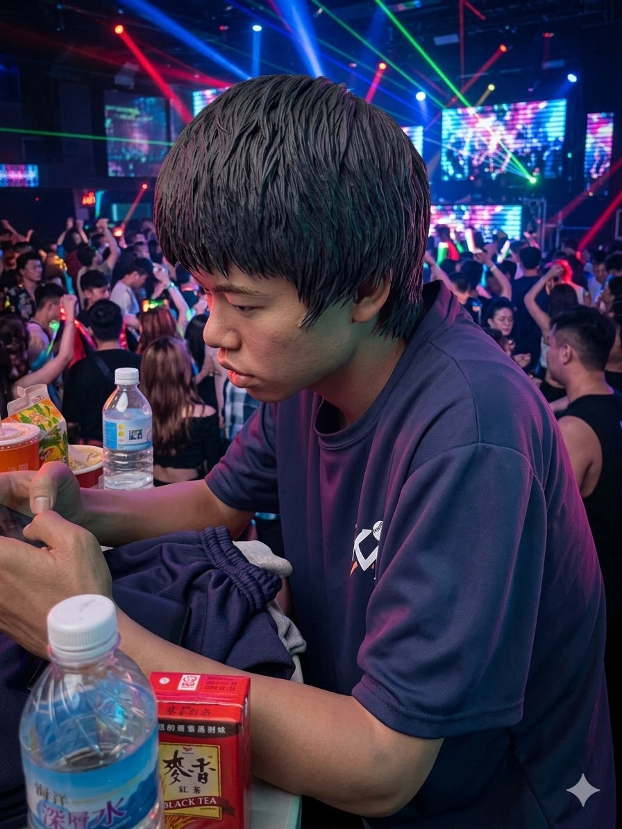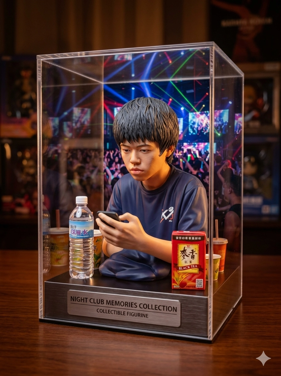 請幫我生成公仔,把後面的人物消除,背景變成夜店,幫我做成一個收藏盒子