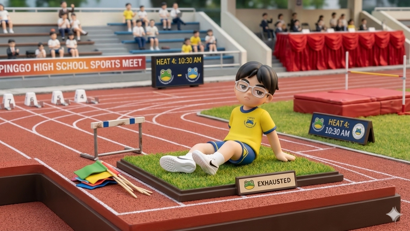 生把這張圖片生成背景是田徑場的人物立體公仔